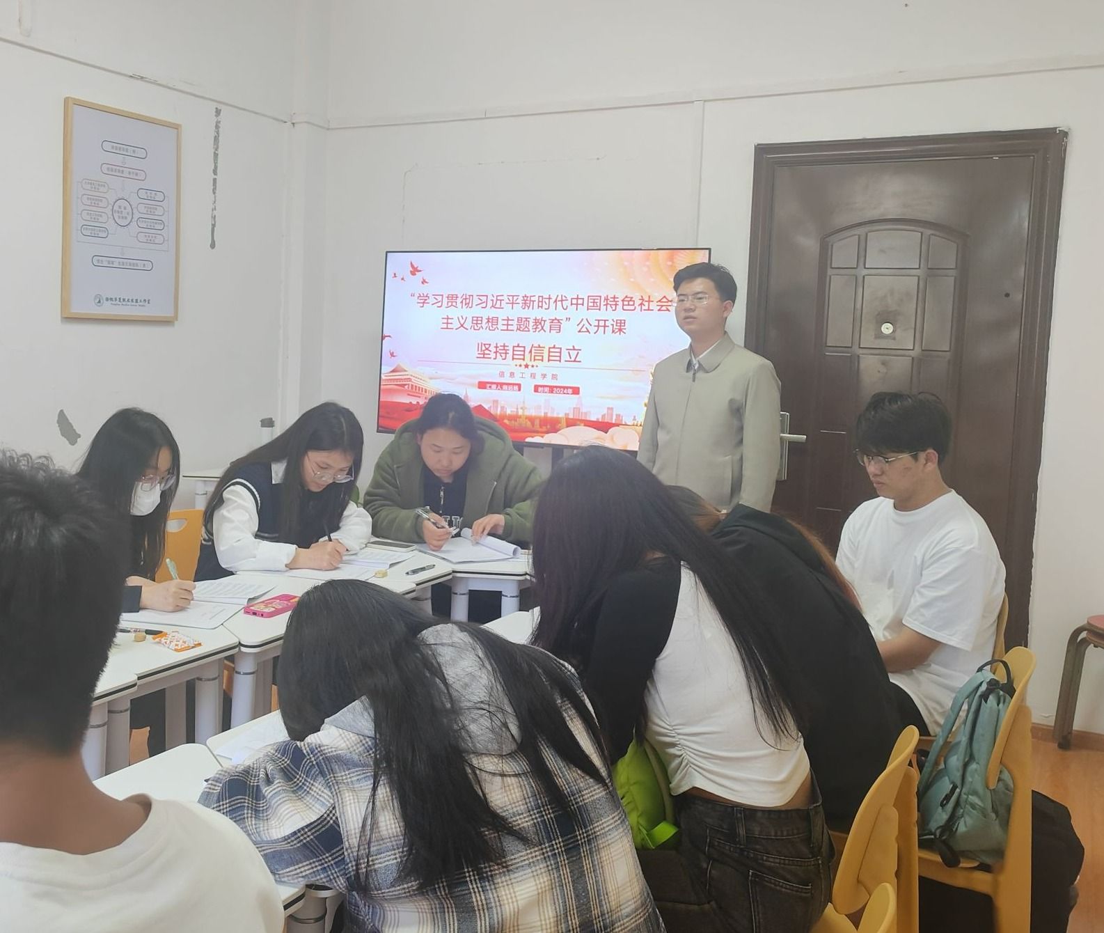 为深入贯彻习近平总书记关于“坚持自信自立”的重要思想,增强广大学生的爱国热情和责任担当,信息工程学院于2024年4月1日在学生社区开展“坚持自信自立”主题学习活动。信息工程学院学生第三党支部书记陈远扬、支部委员万王旋老师和入党积极分子参加本次主题学习。