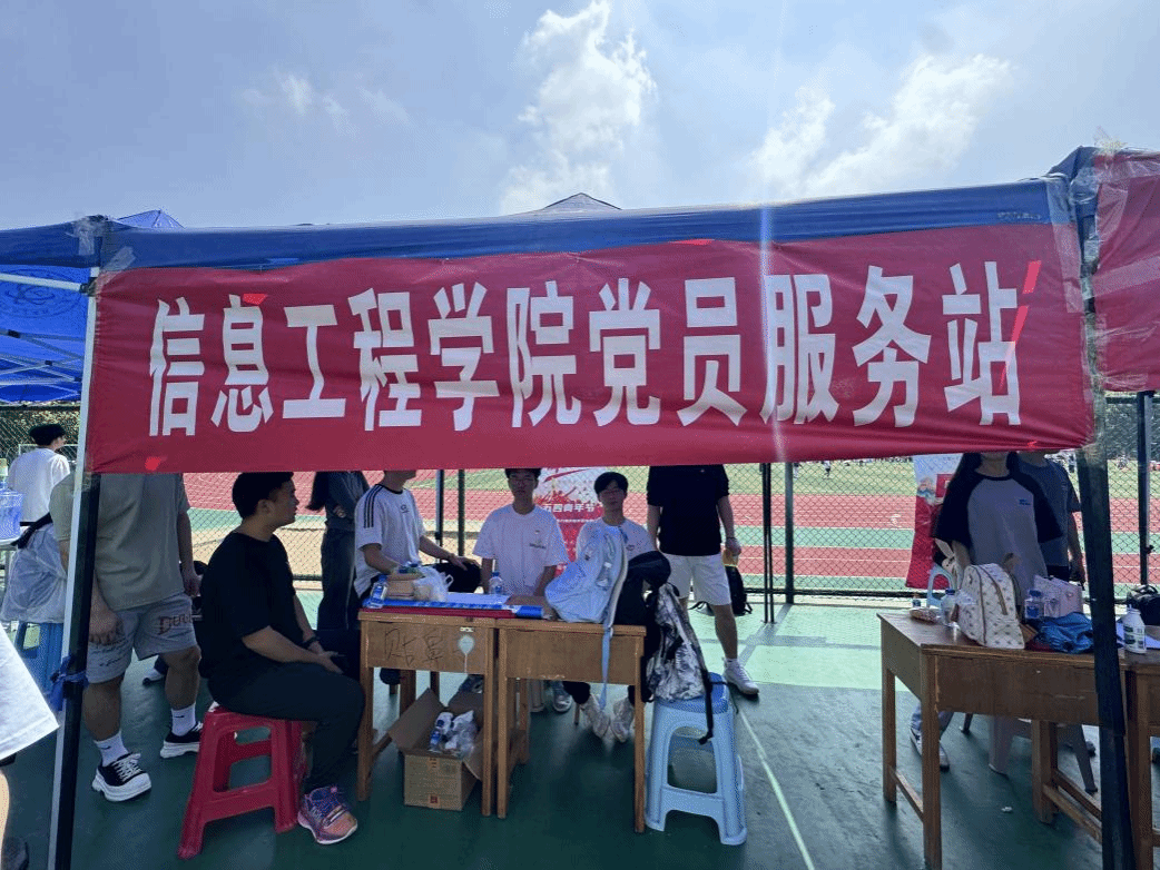 一个独特的站点闪耀其间,成为了一道亮丽且暖人的风景——“党员服务站”,它以其细致入微的服务,稳稳托举起整场运动会的后勤保障,铸就了坚实的后盾,信息工程学院学生党员们与团总支志愿者们肩并肩,心连心,从运动员的检录引导,到现场秩序的维护,每一步都凝聚着他们的汗水与智慧,确保了赛事的流畅与安全,实现了零差错的高效运作。