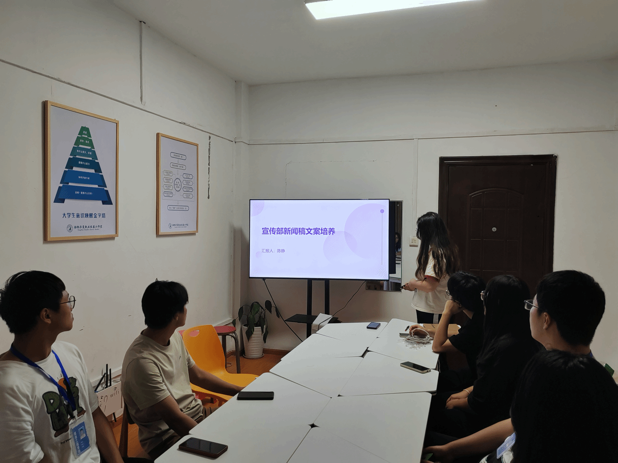 会议伊始,陈静部长提出意见,她针对目前的不足提出了三点要求:第一点在于新闻稿写作技巧,她提出部员应专注于提升新闻写作的核心技能,包括标题撰写、内容结构、语言风格等;其二为活动摄影技术,陈静部长在会上分享了活动摄影的实战经验,讨论如何捕捉活动现场的关键瞬间;三是新闻评论写作指导,她提供了新闻评论写作的方法论,指导如何撰写有深度、有观点的评论文章。副部长鼓励部员们平时要多问,多想,多去尝试,通过这些来锻炼自己的写作技能和拍摄能力。