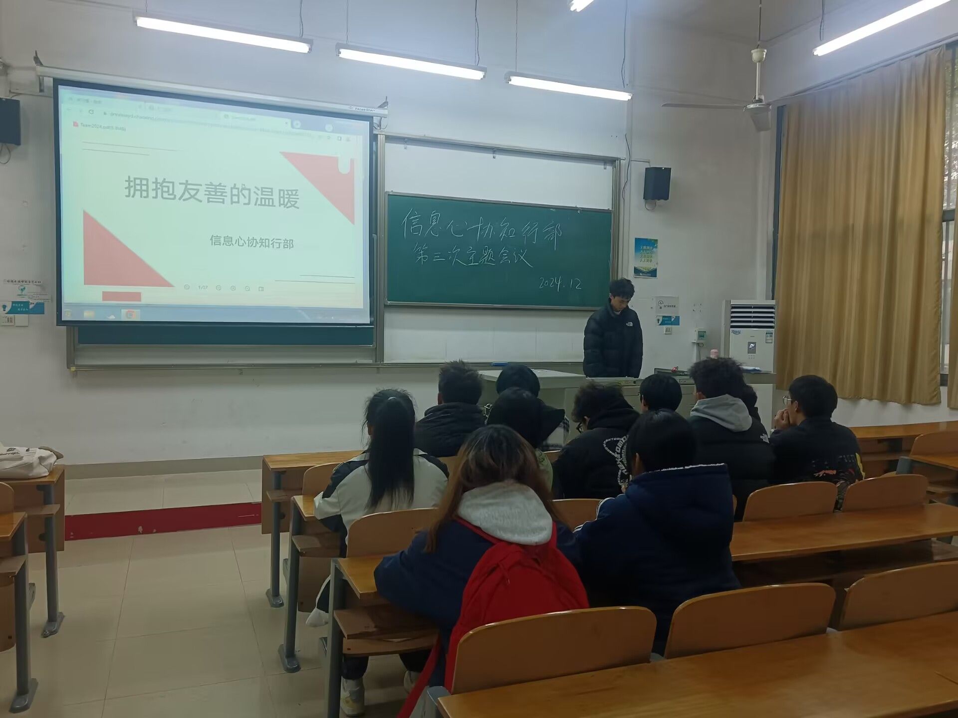 为了增强大学生对心理健康重要性的认识,信息工程学院心理健康协会于2024年12月9日在教室2-106以“拥抱友善的温暖”为主题开展活动,此次活动由知行部部长黄蓉和副部长承晋宇主持,知行部全体成员参加了此次活动。