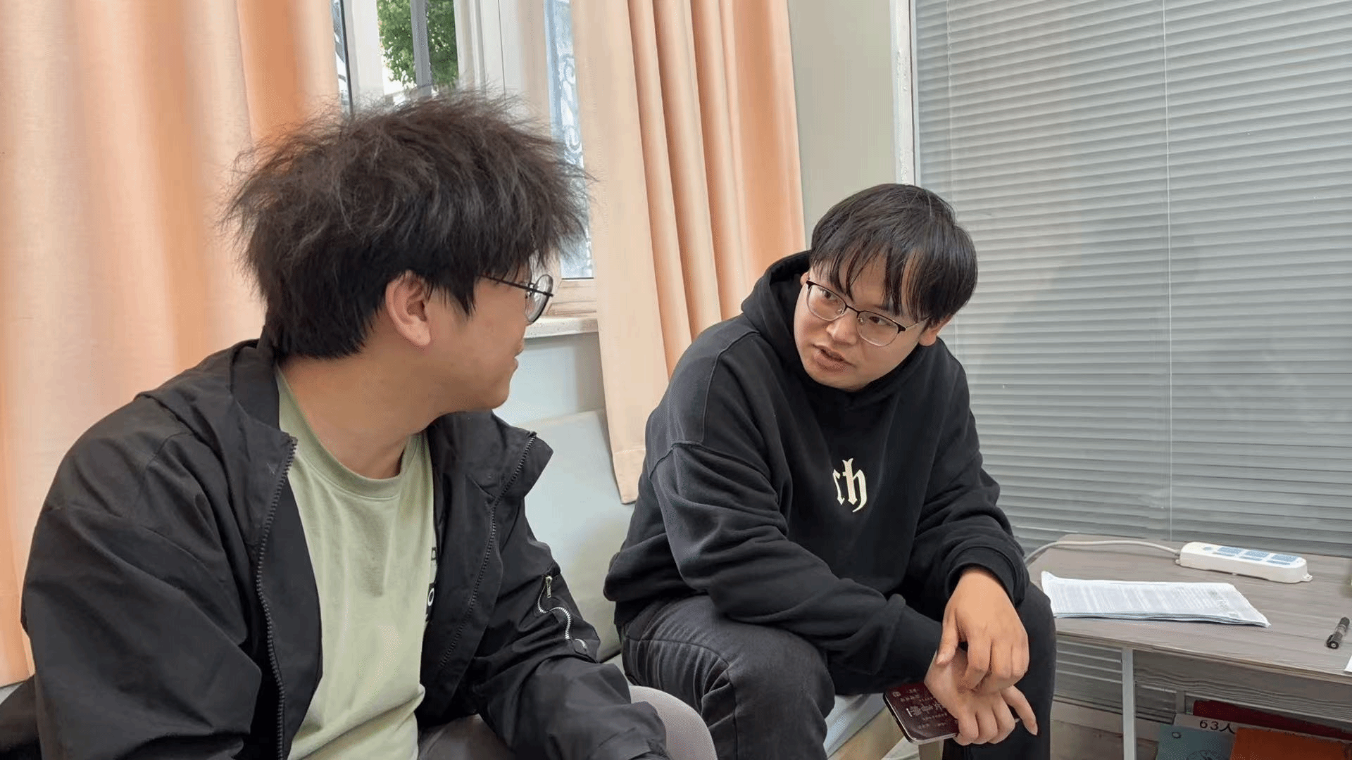 4月10日上午,在1号楼学生社区,我院辅导员张万俊老师与通信 1231 班的高俊飞同学,他们围绕学业规划问题进行探讨。