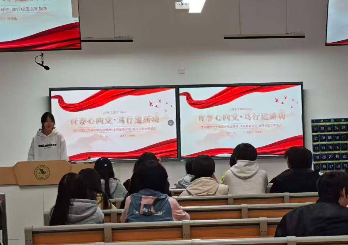 班会上,团支书刘佳烩以《本科教学工作合格评估知识手册》为核心,串联三大主题,详细拆解了他首先解读 “二十字方针” 中 “以评促建、重在建设” 的内涵,强调 “课堂表现、宿舍环境、公共行为都是评估观测的关键指标”。“党史铸魂” 环节,结合 “两弹一星” “精益求精、攻坚克难” 的精神特质,引导同学理解评估对 “教学质量高标准” 的追求;“文明践行” 板块,针对评估中 “学风建设”“育人环境” 指标,明确课堂准时到课、积极互动、宿舍达标 “五星级文明寝室”、公共区域文明有序、展现学子风貌的具体标准,指出文明行为是评估的 “直观加分项”。