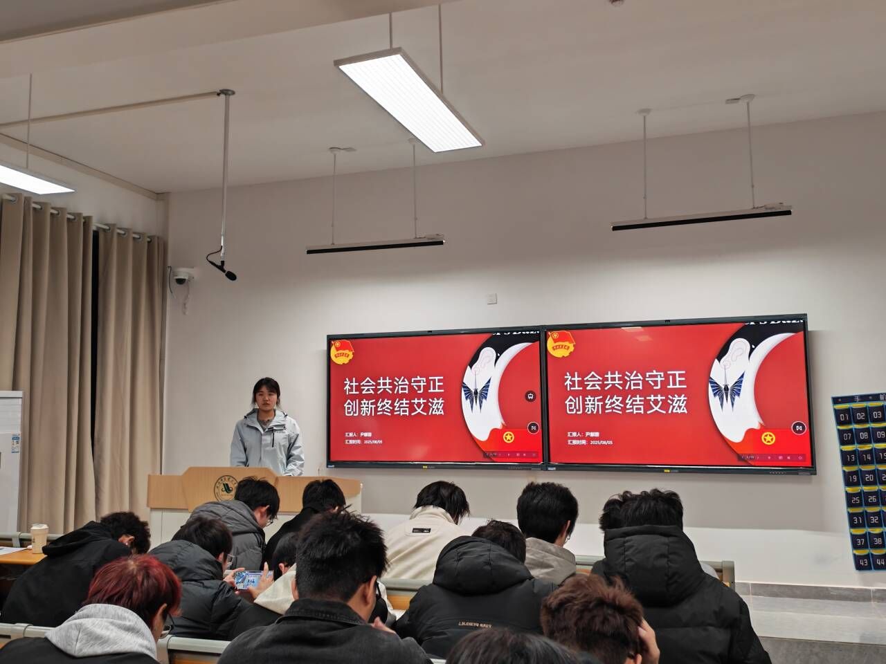 班会开始,团支书尹麒蓉以“社会共治,守正创新,终结艾滋”为载体,结合青少年认知特点与校园场景,从艾滋病基础知识、传播途径、防治方法到社会共治意义,系统讲解了防艾关键要点。