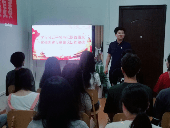会议上,陈老师带领入党积极分子观看了贺信的内容。习近平总书记在贺信中指出,我们党致力于铸就社会主义文化新辉煌。党的十八大以来,我们把文化建设摆在治国理政的突出位置,不断深化对文化建设的规律性认识,推动文化传承发展,社会主义文化强国建设迈出坚实步伐。陈老师向入党积极分子们强调,文化兴盛,是民族的复兴的强大支撑;文化繁荣,是时代进步的鲜明标识。中国式现代化新征程上,我们必须更加坚定文化自信,自觉肩负起新的文化使命,不断铸就光耀时代、光耀世界的中华文化新辉煌,源源不断地为强国建设、民族复兴注入强大精神力量。