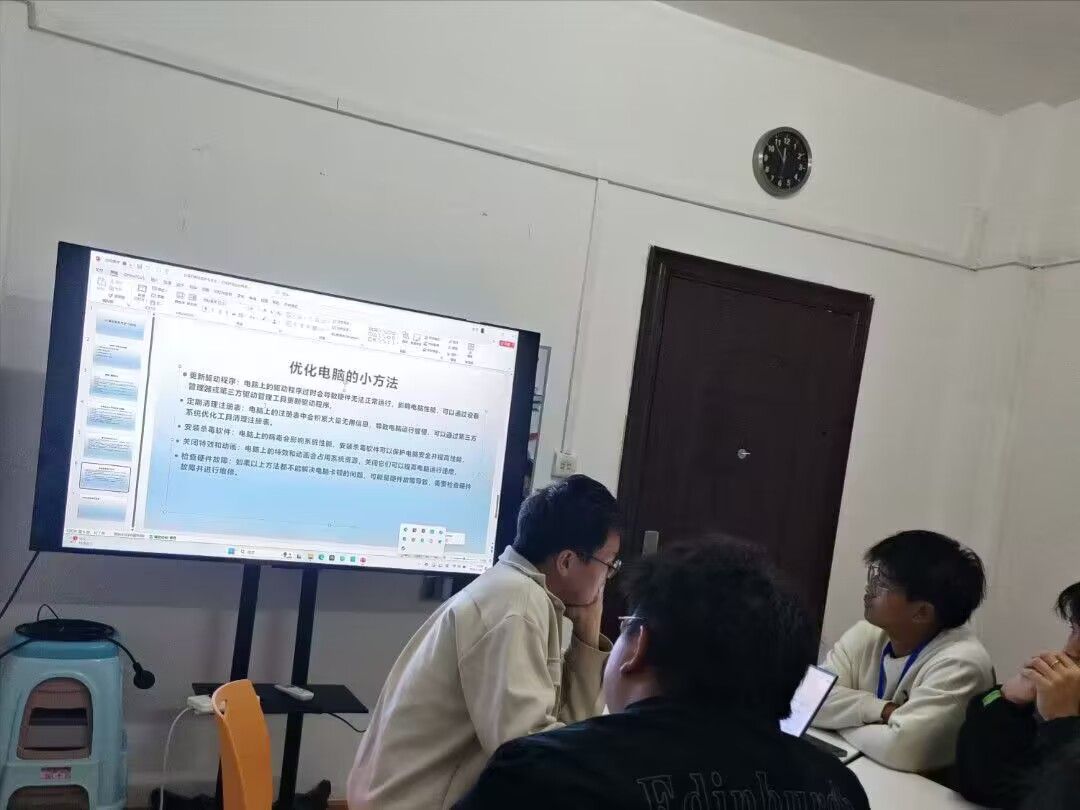 培训会上,电脑维修队副队长杨振辉和队员齐振豪、肖政宇为其他队员们讲解了电脑维修的基础知识和技巧。首先肖政宇从硬件方面介绍了电脑的组成和功能,包括主板、内存、硬盘等重要部件。随后,他们详细解释了电脑常见故障的检测与排除方法,如内存不足、c盘爆满、无法启动等。副队长杨振辉和齐振豪通过生动的案例和实际操作演示,使得队员们更加深入地理解了电脑维修的技术要点。最后分享了一些实际工作中遇到的案例,并结合具体步骤讲解了解决问题的方法。队员们积极参与讨论和互动,提出自己的疑问,杨副队长和齐振豪队员也一一耐心地解答。