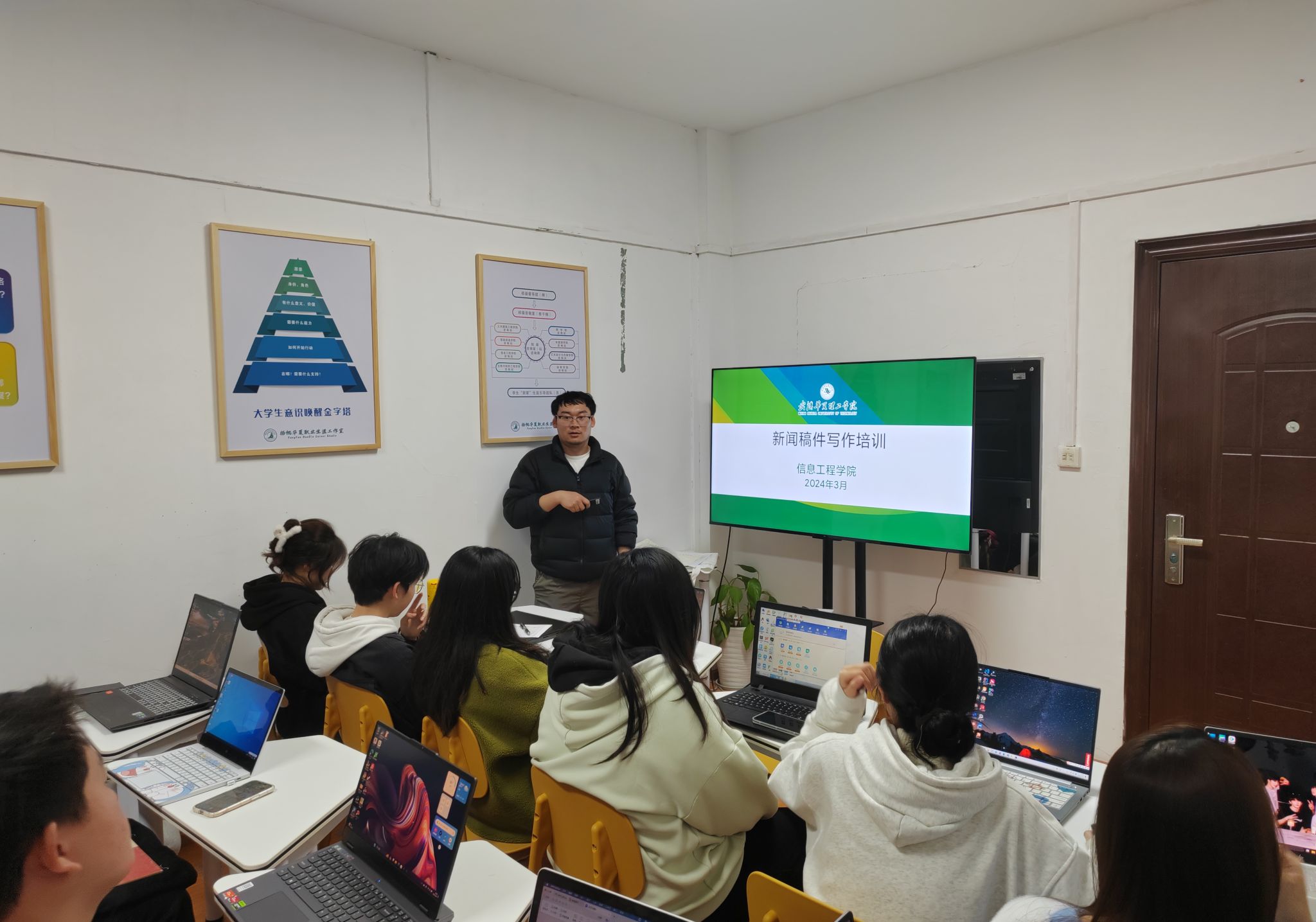 首先,万老师就如何选题做了阐述,又向同学们讲解了新闻具有时效性、准确性、真实性,强调大家在撰写新闻稿时一定要在注意这些特征。随后,万老师围绕学习学校宣传管理办法、图片拍摄、信息写作等方面开展了详细的介绍,教大家如何发现有价值的新闻、如何提高新闻敏感性、如何选择独到的新闻角度、怎样写好信息等。最后,具体的给大家演示了后台宣传网址的具体使用方法和注意事项,并叮嘱学生在初期可以看看学院关于新闻栏目的划分,多翻阅优秀的报纸和期刊,提升业务能力。