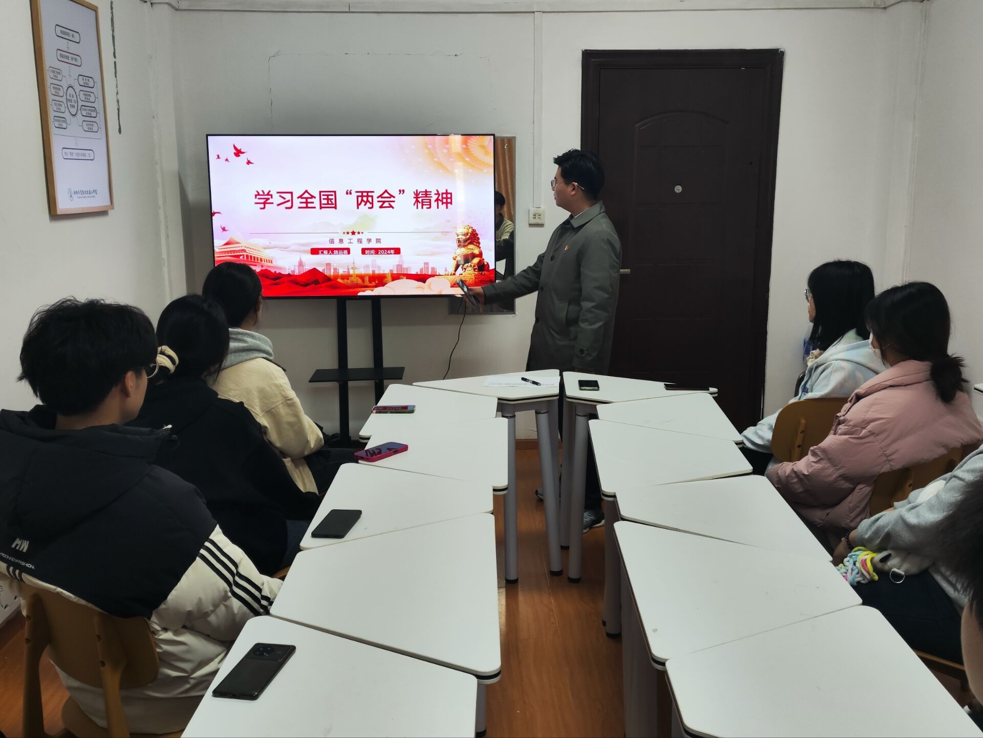 为了深入学习贯彻全国两会精神,增强学生的政治意识、大局意识和责任意识,激发广大学生的爱国热情,促进学生全面成长。2024年3月18日信息工程学院学生第三党支部在学生社区开展学习全国两会精神活动。支部书记陈远扬、党员、入党积极分子参加本次学习。