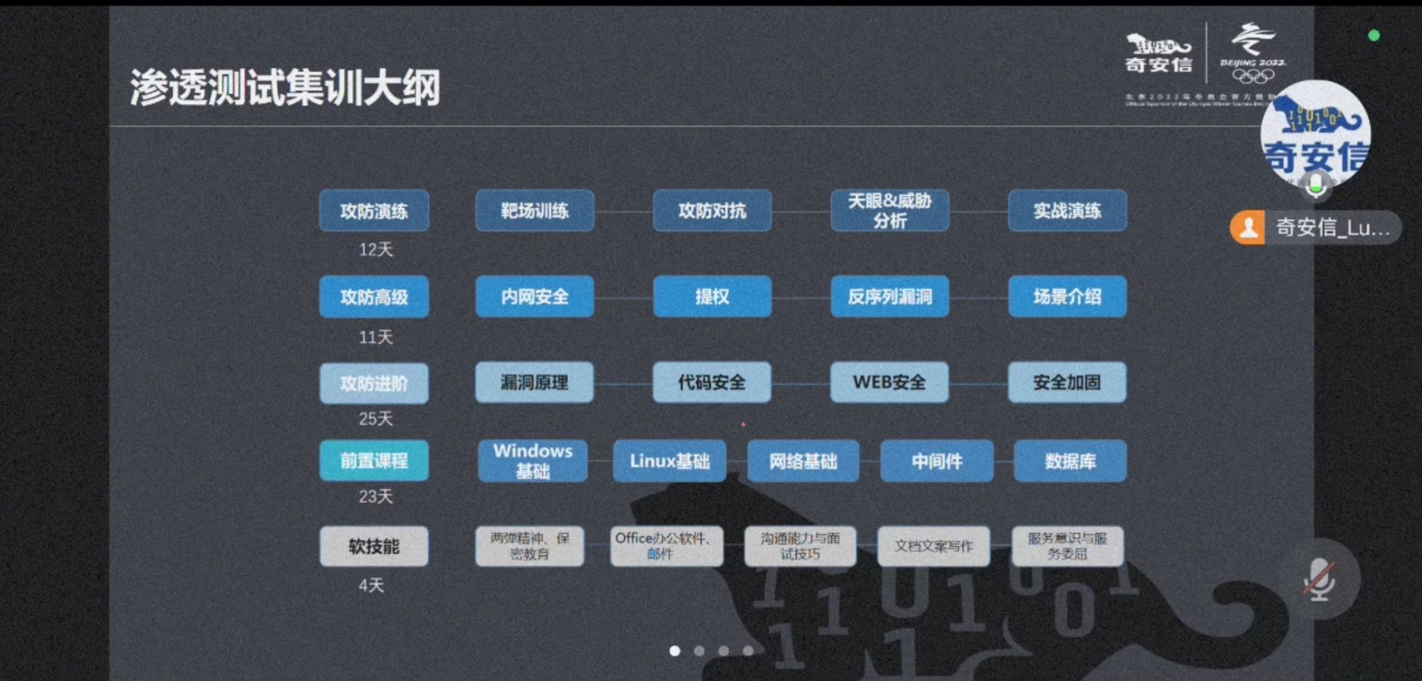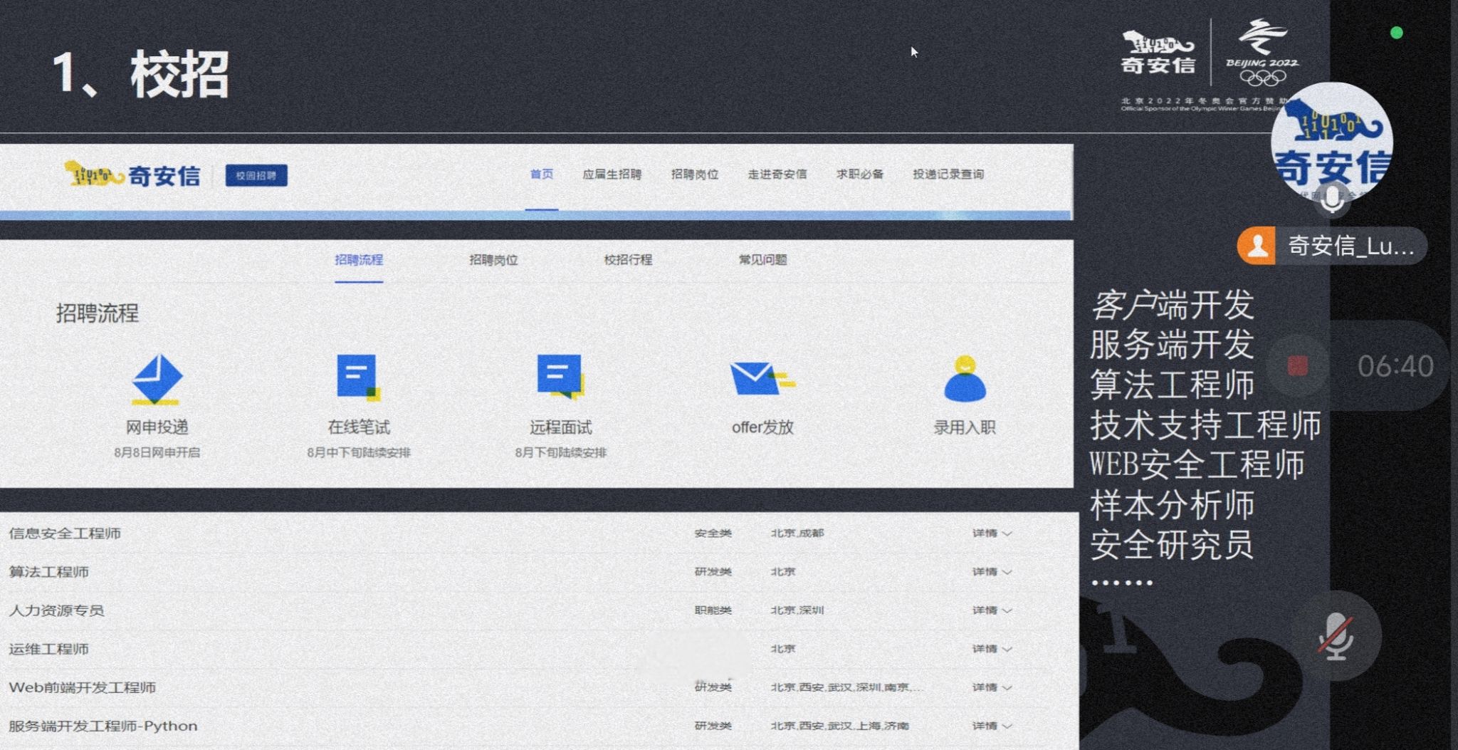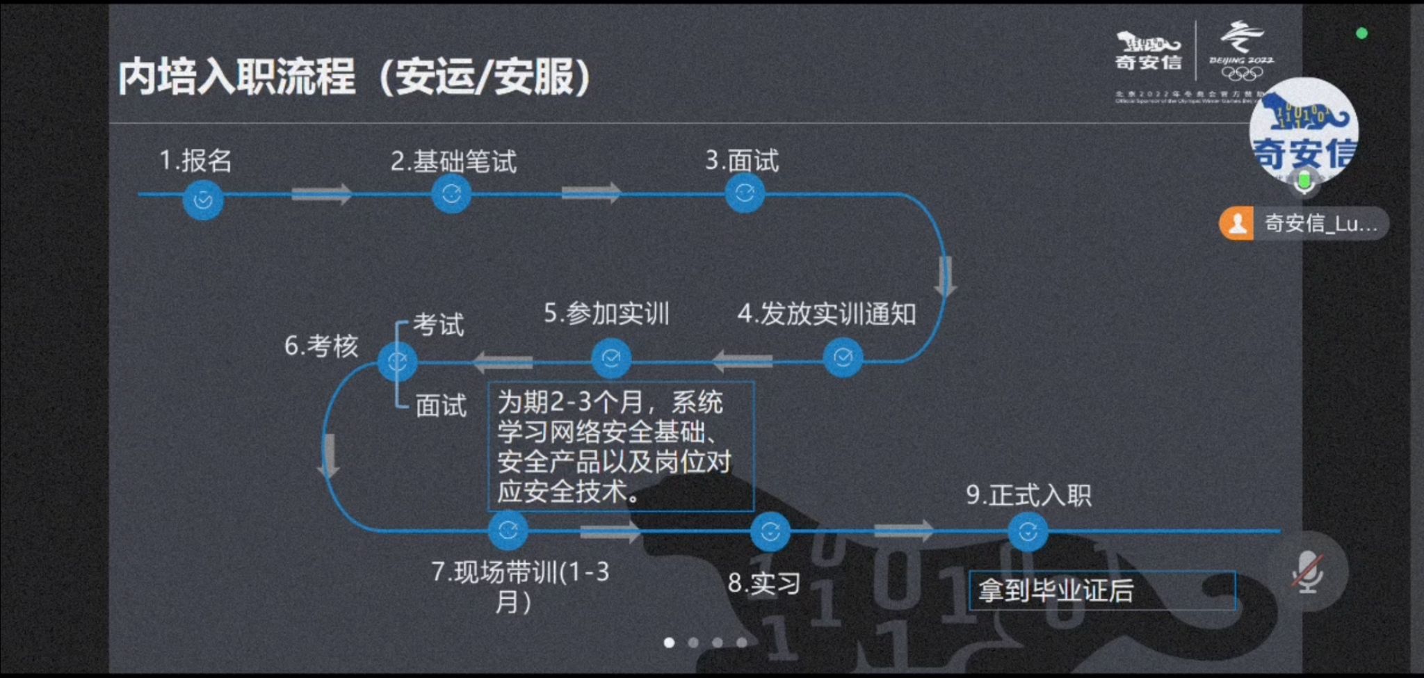 随后,闫军霞为学生们介绍了奇安信集团的企业内培选拔入职机制。目前,内培选拔分为“安全运维服务”以及“网络安全服务工程师”两个方向,奇安信为学生们免费提供为期2-3个月的赋能培训,可以系统地学习到网络安全基础、安全产品以及岗位对应的安全技术;在完成培训后,学生可以选择参加统一考试与面试,如考核通过则会进入真实项目进行1-3个月的现场带训学习,随后进入奇安信集团进行实习,并在顺利毕业后即可办理正式入职。