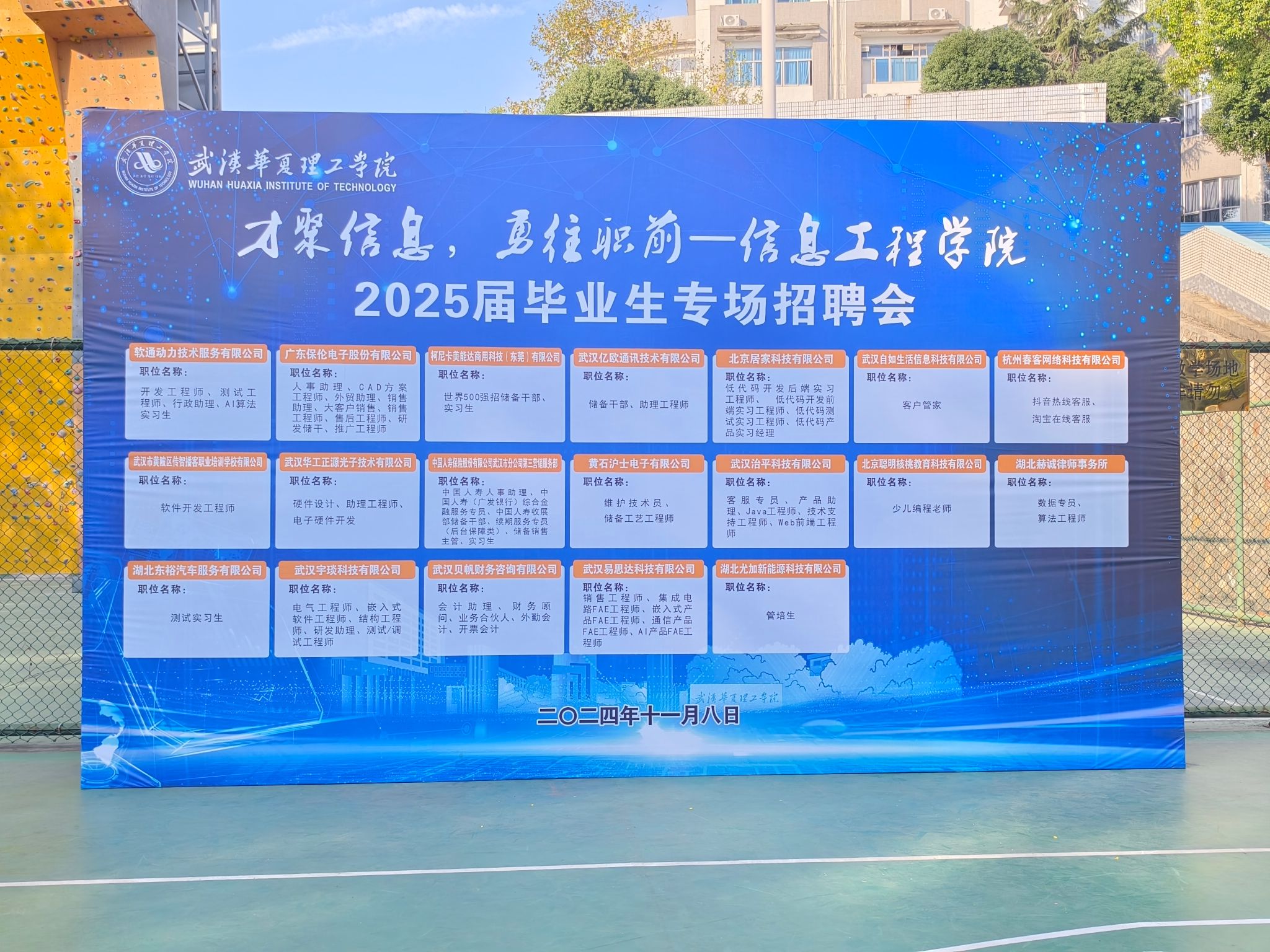 为积极响应国家号召,拓宽毕业生就业渠道,扎实推进毕业生就业工作,11月8日上午,我院举办“才聚信息,勇往职前”——信息工程学院2025届毕业生专场招聘会。本次招聘会吸引了武汉华工正源光子技术有限公司、广东保伦电子股份有限公司、黄石沪士电子有限公司等20家用人单位参会,提供岗位百余个。