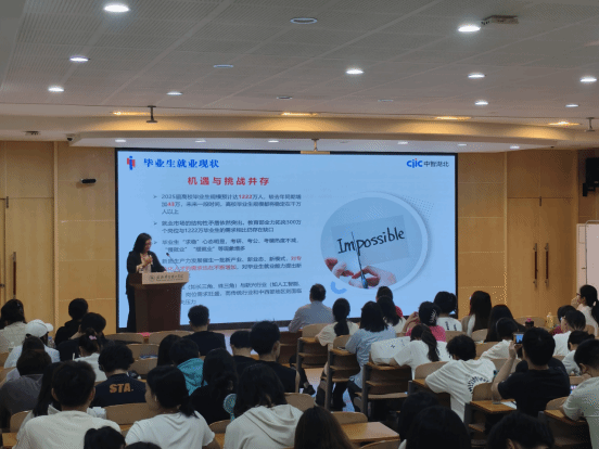 杨青从高校毕业生就业现状、高质量就业的内涵、政策环境的影响、高质量就业的途径四个方面进行了深入讲解,帮助学生明确自身定位,树立正确的择业观和就业观,并深度剖析了毕业生在求职过程中遭遇的各类困扰与挑战。鼓励学生明确方向,调整自我预期,培养抗压能力,不断提升自身的专业技能与适应力。