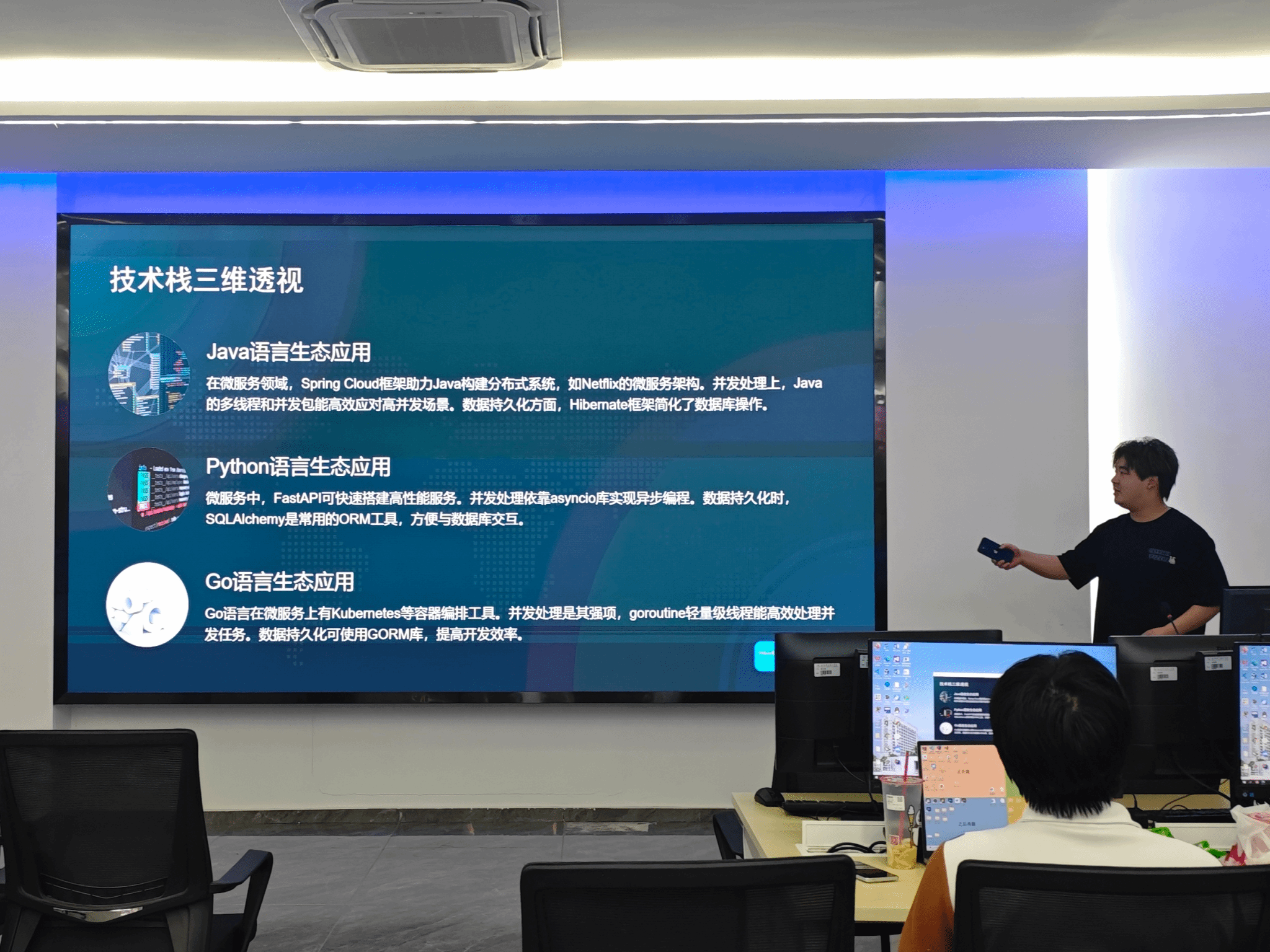 随后,由软件工程1211的吴俊杰同学进行分享。他主要结合自己目前所在企业的组织架构情况,为同学们简单介绍了企业中一般会有的技术类岗位,以及每个岗位大致的工作内容,帮助同学们了解未来可以去考虑从事的岗位;然后,他为同学们分享了一些笔面试闯关小秘籍,例如:写代码时应该注意什么、什么是八股文、如何去有效的背八股等,并且和现场的同学开展模拟面试环节,沉浸式体验技术岗位的面试过程,能够帮助同学们未来能够有针对性的准备面试。