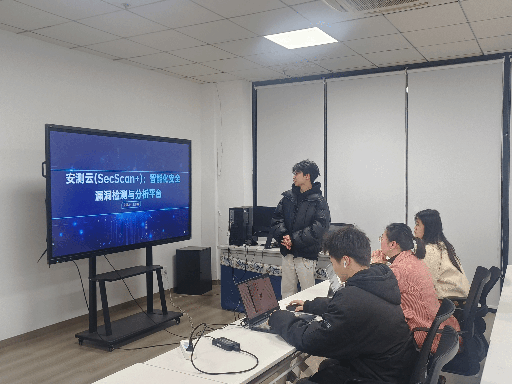 罗瑜老师和梁洁老师在指导安测云项目的过程中,充分发挥了他们的行业经验和学术底蕴,促进项目的进一步更新和完善,从ppt、项目功能模块展示、参赛时的注意事项,方方面面给出了建设性的指导意见和建议。王彦群同学认真倾听并记录,提出了改进计划,为本月22号的省赛做全方位的准备。