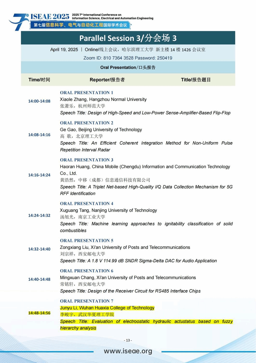 近日,第七届信息科学、电气与自动化工程国际学术会议(ISEAE 2025)成功举办。信息工程学院自动化1231班李峻宇同学以线上方式参会,并作了题为《Evaluation of Electrostatic Hydraulic Actuator Status Based on Fuzzy Hierarchy Analysis》(基于模糊层次分析的静电液压执行器状态评估)的全英文学术报告,展示了其在科技创新领域的研究成果。