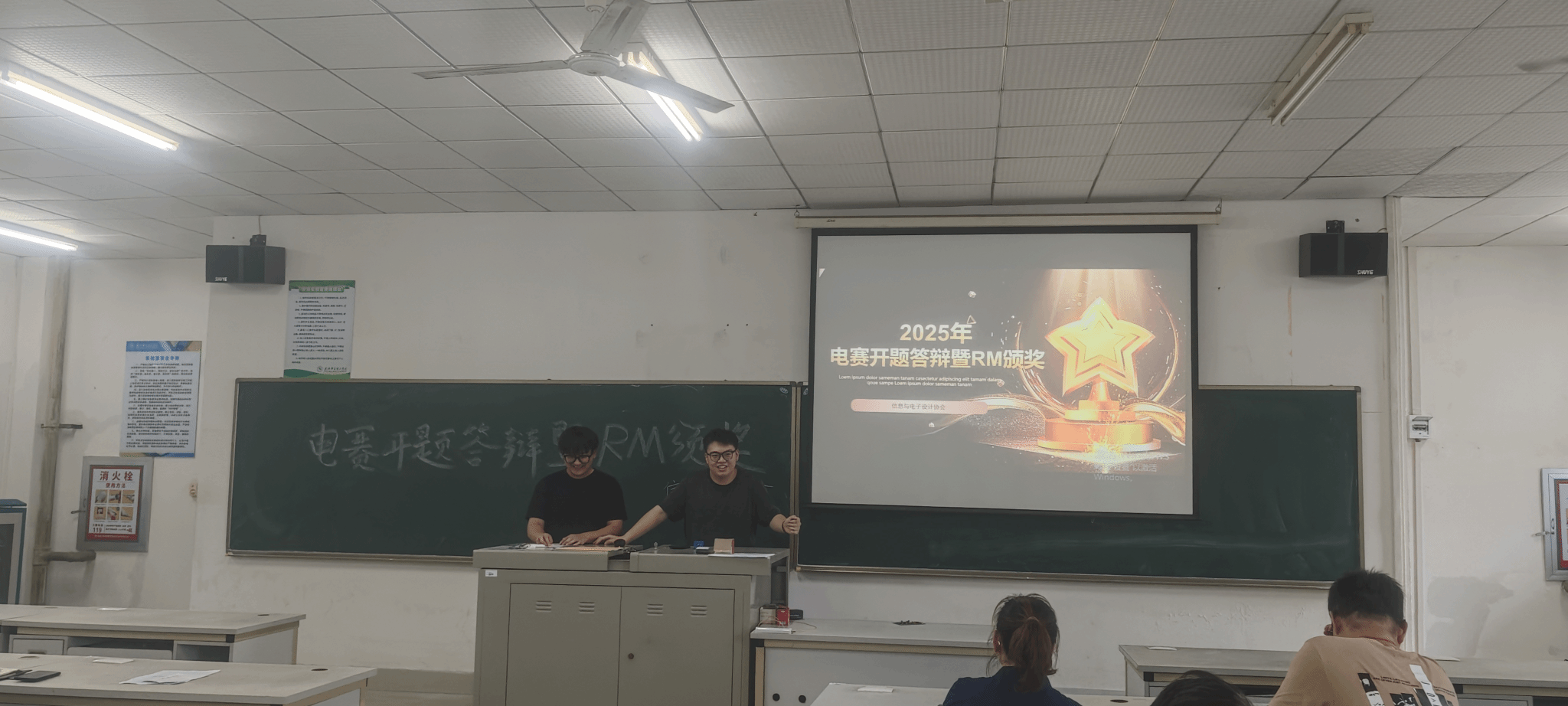 在热烈氛围中,RM颁奖环节开启,获奖同学上台领奖,他们用努力与拼搏为校争光,激励着在场每一位学子。颁奖后,今年参赛的6组电赛队伍依次进行开题报告,围绕选题背景、研究思路等内容,展现出创新思维与专业功底,现场交流热烈。