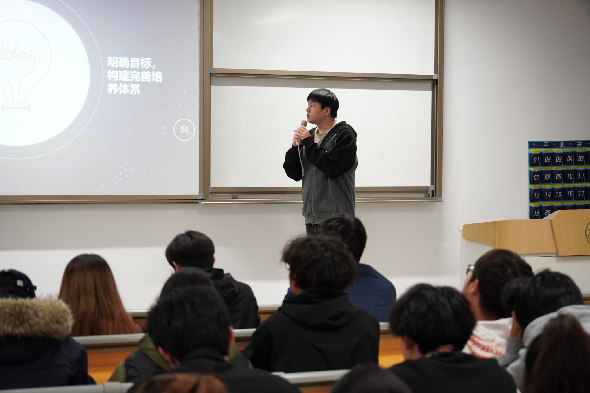 在核心分享环节,六大协会的优秀代表依次登台,结合自身科创经历传经送宝。人工智能与机器人协会的胡坤明分享了参与睿抗机器人开发者大赛的备赛历程,他带领团队攻克ROS操作系统应用、图像识别等技术难题,最终斩获全国总决赛两项二等奖,其展示的团队协作搭建临时赛场的经历,让新生深刻体会到科创路上的坚守与担当。 大数据协会方佳垚围绕“数聚青春 智创未来”主题,介绍了协会“理论学习-技能实训-赛事实战-社会服务”的培养体系,分享了在华为ICT竞赛、全国大数据分析技术技能大赛中的获奖经验,展现了数据技术在乡村振兴、民生服务中的应用价值。信息与电子设计协会邱殿玟聚焦全国大学生电子设计竞赛和RoboMaster机甲大师赛,详解了从基础焊接、嵌入式编程到机器人搭建的成长路径,其团队在机甲大师高校联盟赛中斩获的一等奖荣誉,激发了新生对电子科创的浓厚兴趣。创新创业协会李峻宇带来“戍边新胄——基于光缕衣的可穿戴智能系统”等获奖项目分享,从项目调研、技术创新到市场转化,完整呈现了创业项目孵化全过程,其作品斩获湖北省“挑战杯”铜奖、中国国际大学生创新大赛省级银奖的成绩,传递了“敢想敢闯、务实创新”的创业理念。算法协会王甜甜、数理应用与建模协会何升权则分别从竞赛备赛策略、团队协作技巧、核心技能提升等方面分享经验,为新生提供了可落地的科创入门指南。活动现场还设置了协会互动咨询环节,六大协会通过展示特色成果、解答新生疑问,吸引了众多新生驻足交流。各协会的招新群二维码在屏幕滚动展示,方便新生后续深入了解。