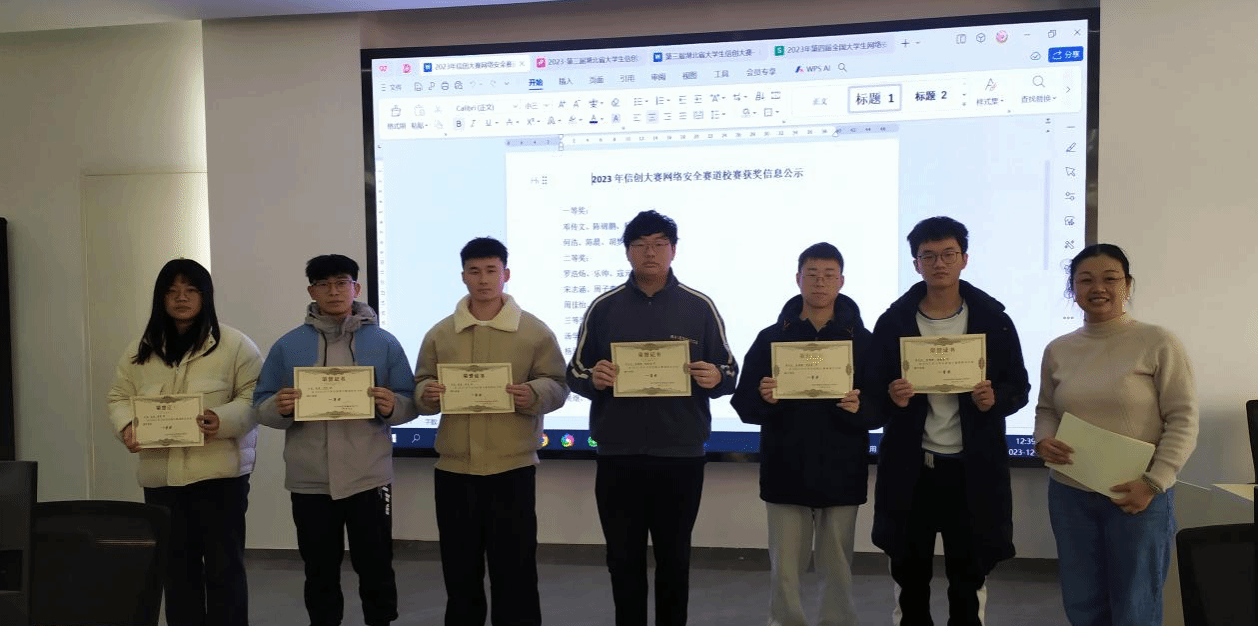 2023年12月27日,在苏永红老师的组织下学生在信息楼432实验室进行2023年大学生信创大赛网络安全比赛的颁奖和全国大学生网络安全精英赛宣讲,本次比赛共有十三个团队参加,每个团队3人,信息工程学院计算机、软件工程、物联网工程、自动化等专业学生参赛,经过激烈角逐,最终十支队伍晋级参加信创大赛网络安全赛道省赛。其中2组获得校赛一等奖,3组获得校赛二等奖,5组获得校赛三等奖。
