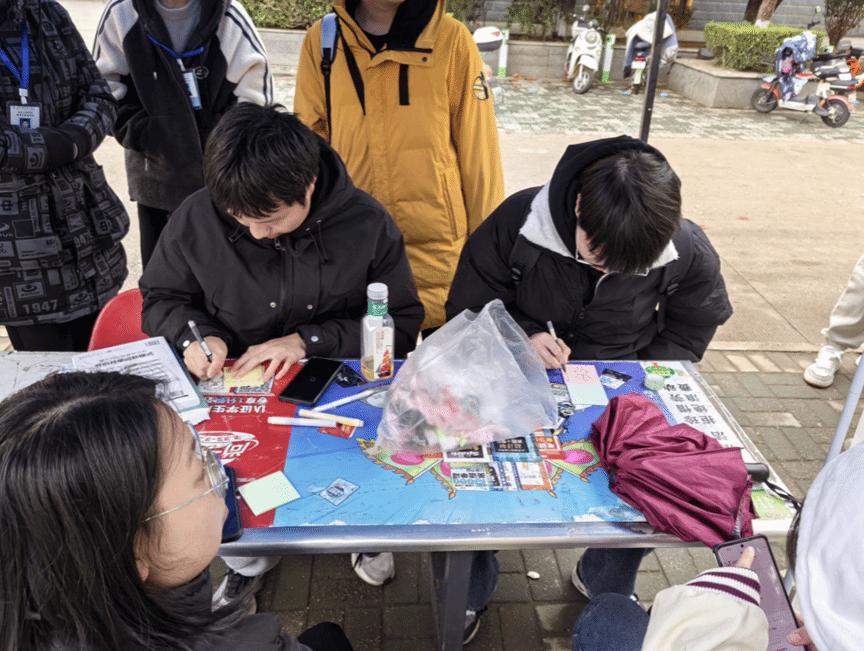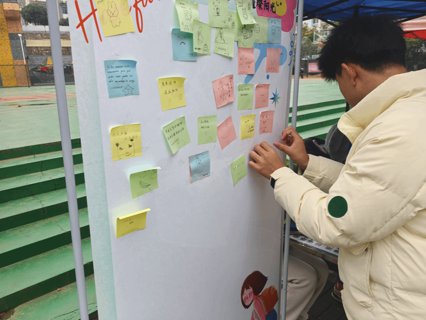 活动现场设置了独特的笑脸墙,以易拉宝为载体,吸引了众多同学参与。同学们在标签纸上畅所欲言,写下近期的开心事、烦恼事或心愿,也可自由涂画,用色彩与线条表达内心世界,无论是面部简笔画、心情画还是喜爱的漫画形象,都跃然纸上。完成创作的同学们均可获得一份精心准备的小奖品,还能与笑脸墙合影留念,记录下这一温馨时刻。