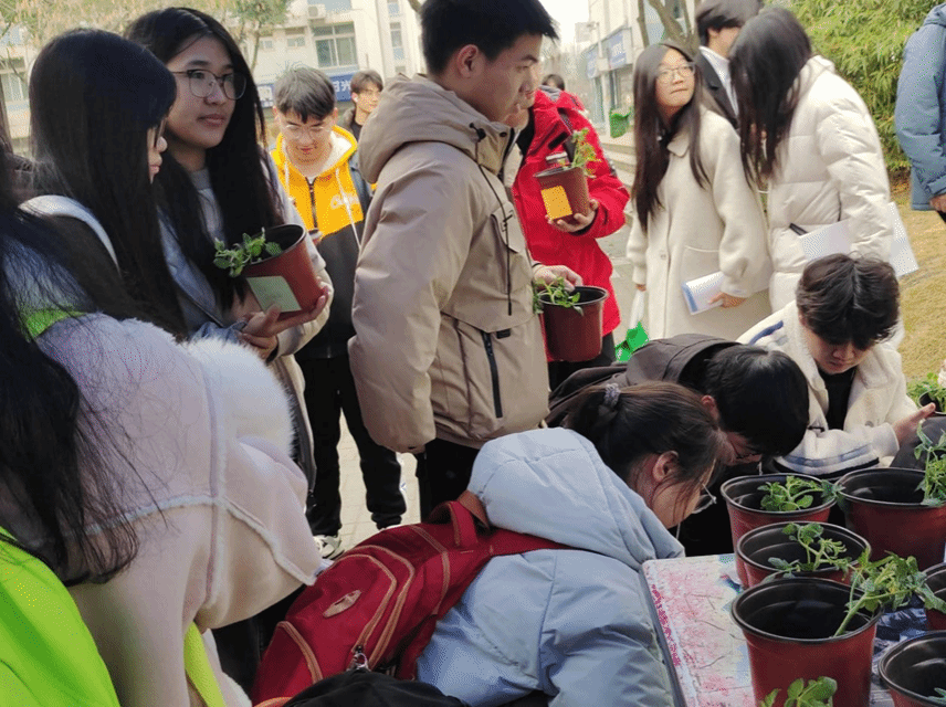 此次活动分为两个部分,盆栽认养种植和绿色承诺签字墙。参与盆栽认养种植的同学在摆摊地点领取盆栽及工具并加入种植群,每天在群内参与接龙管家拍照打卡,记录种子生长。参与绿色承诺签字墙的同学可在签名墙处选择喜欢的便利贴,用黑笔写下自己对温室效应危害的感悟以及自己日后对其如何采取措施。参与活动的志愿者们都非常热情的帮助同学们往花盆中填土,给同学们分发便利贴。整个活动氛围有趣,同学们都很热情地参与认养盆栽活动。