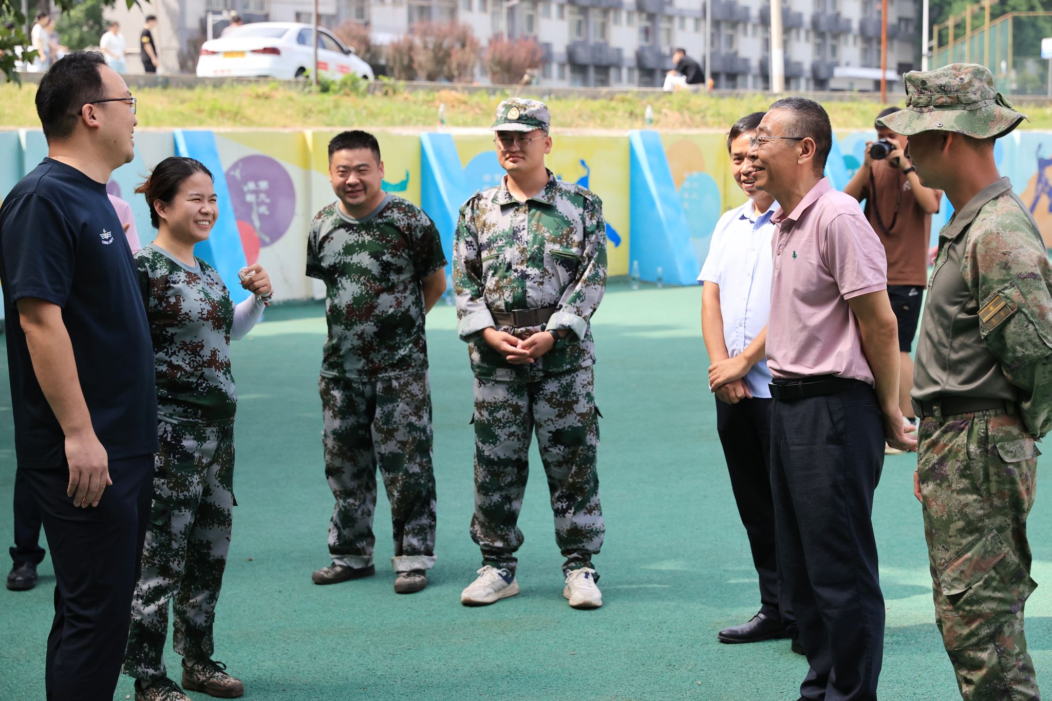 随后,李海民依次走访慰问各学院军训大本营,与学院领导、新生辅导员及新生亲切交谈。他勉励同学们刻苦训练、珍惜训练时光,在军训中不断磨练自身意志品质,更好地融入大学学习和生活。同时,他要求各学院加强服务保障,配合完成军事训练及入学教育工作,确保军训工作安全、有序、高效开展。