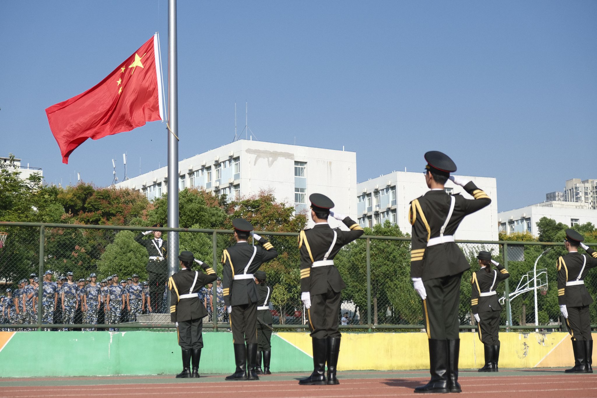 大会在庄严的升旗仪式中拉开帷幕,全体师生起立合唱国歌,向国旗行注目礼。