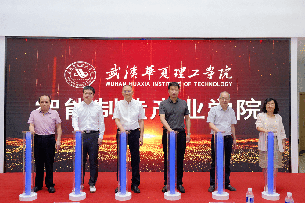吴永桥、丁成忠、李猜、余世浩与岚图汽车科技有限公司唐杨涛、蓝卓数字科技有限公司张峻瑞共同为产业学院揭牌。