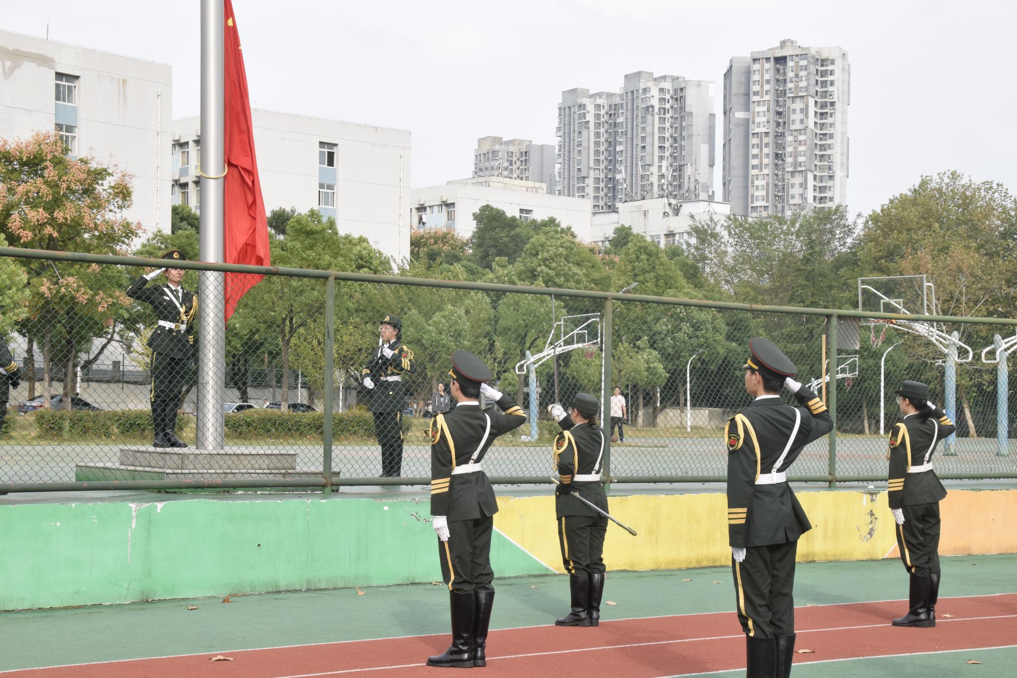 开幕式在庄严的升旗仪式中拉开帷幕。全体人员起立,向国旗行注目礼。