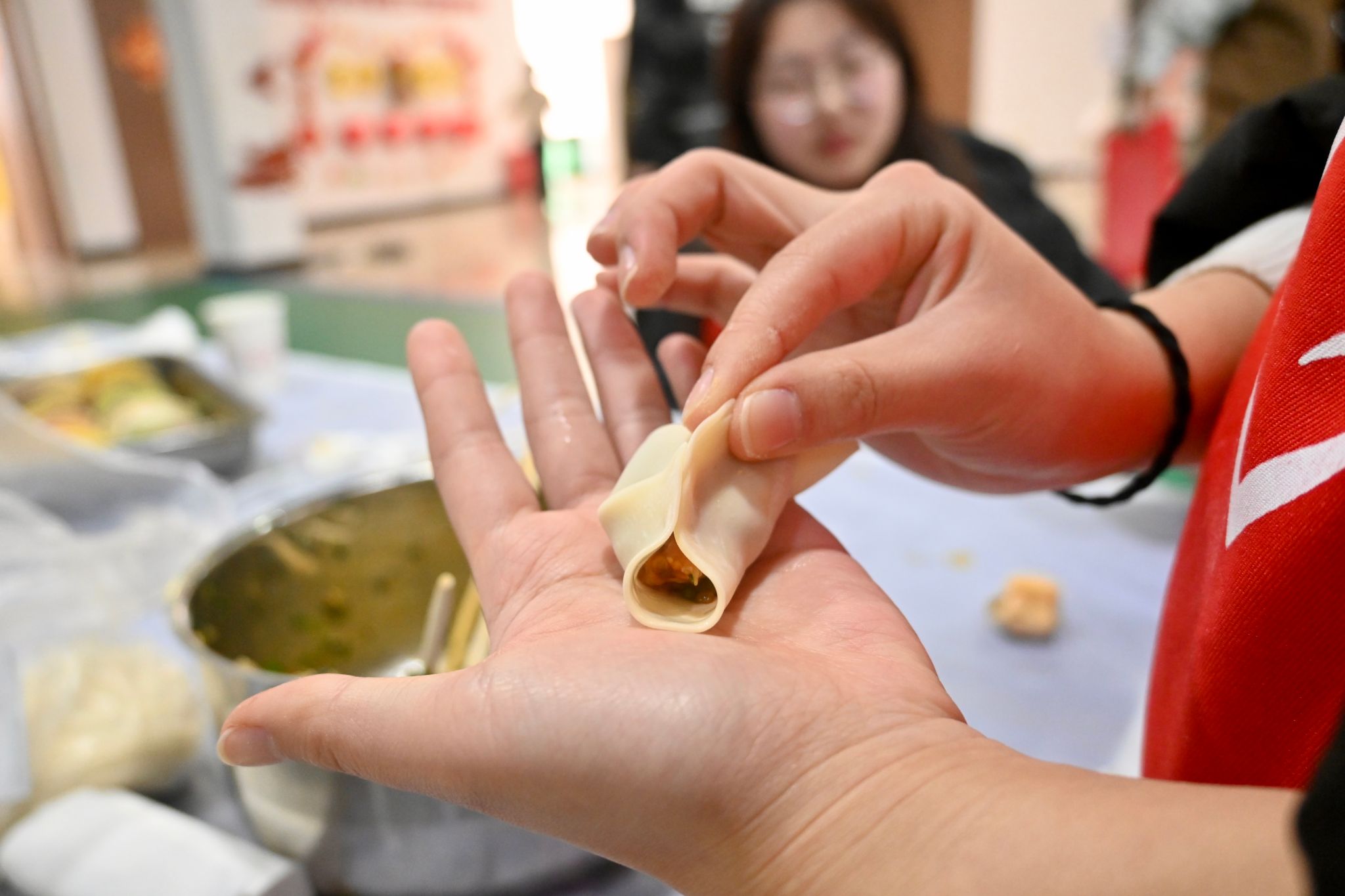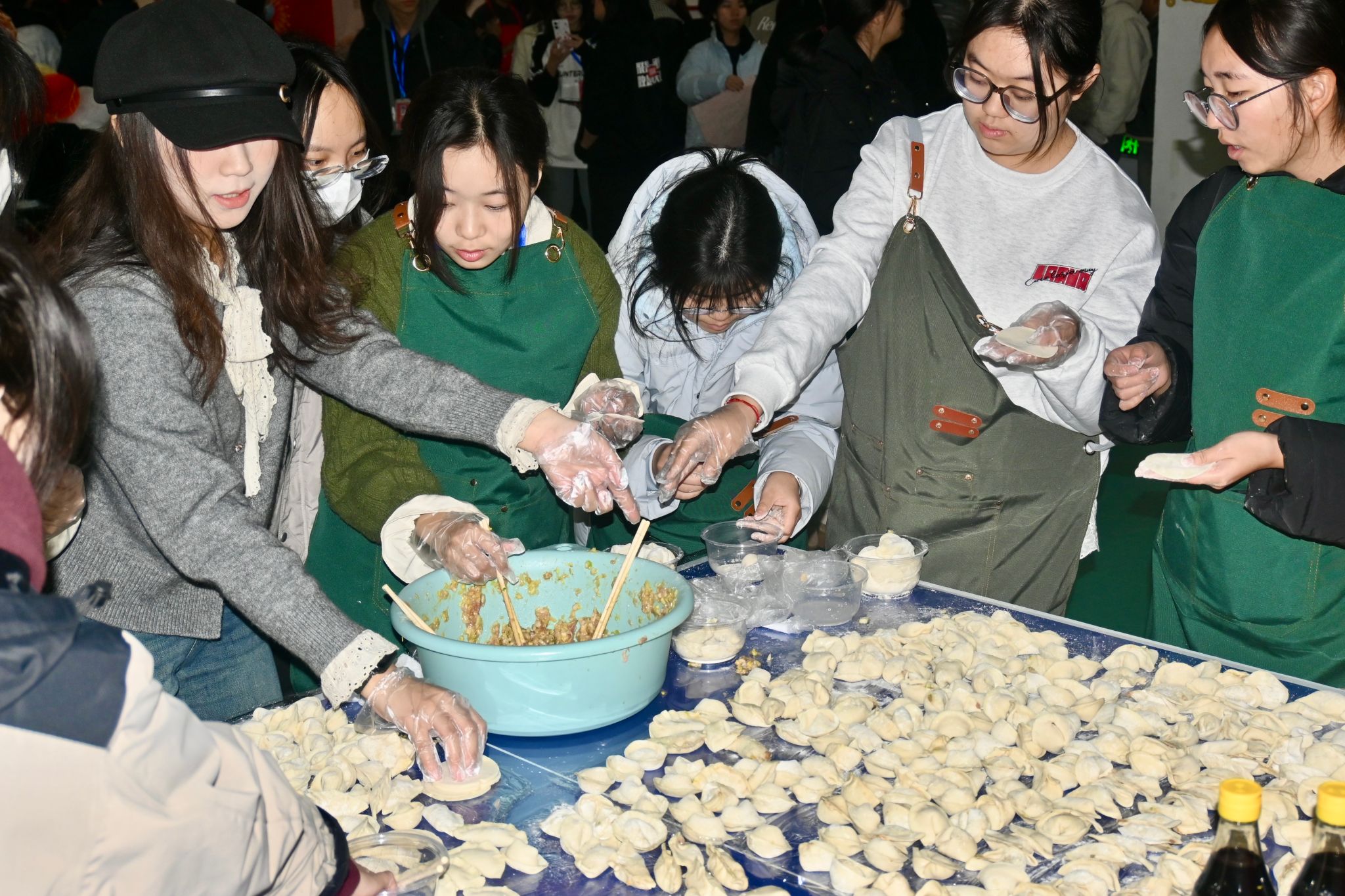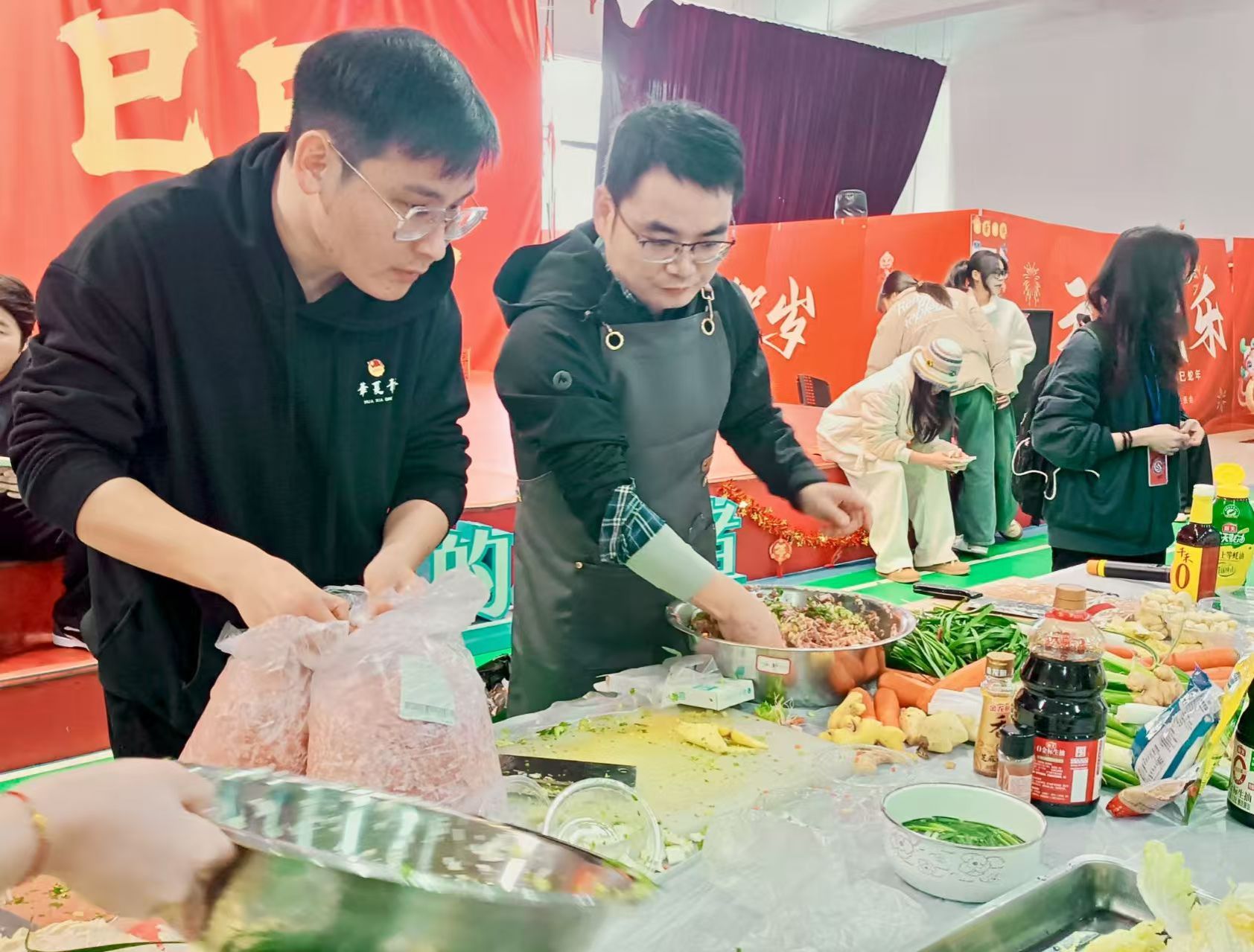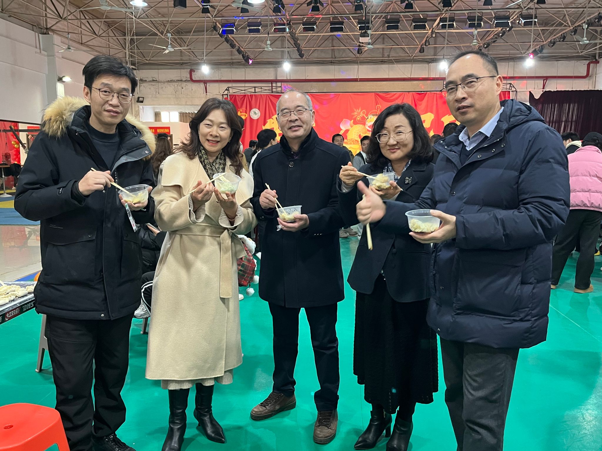 下午四时,李园食堂三楼盛大的“饺子宴”活动拉开序幕。各学院师生围坐一起,用蔬果汁与面粉调出紫、粉、黄、绿等不同颜色的饺子皮,在工作人员的引导下调制馅料、动手包制……师生们踊跃参与,分工明确,配合默契,一锅锅热气腾腾、香气扑鼻的饺子在大家的共同烹制下陆续出锅,吸引了全校师生前来品尝。大家共同的劳动成果也获得了校领导们的高度赞赏。