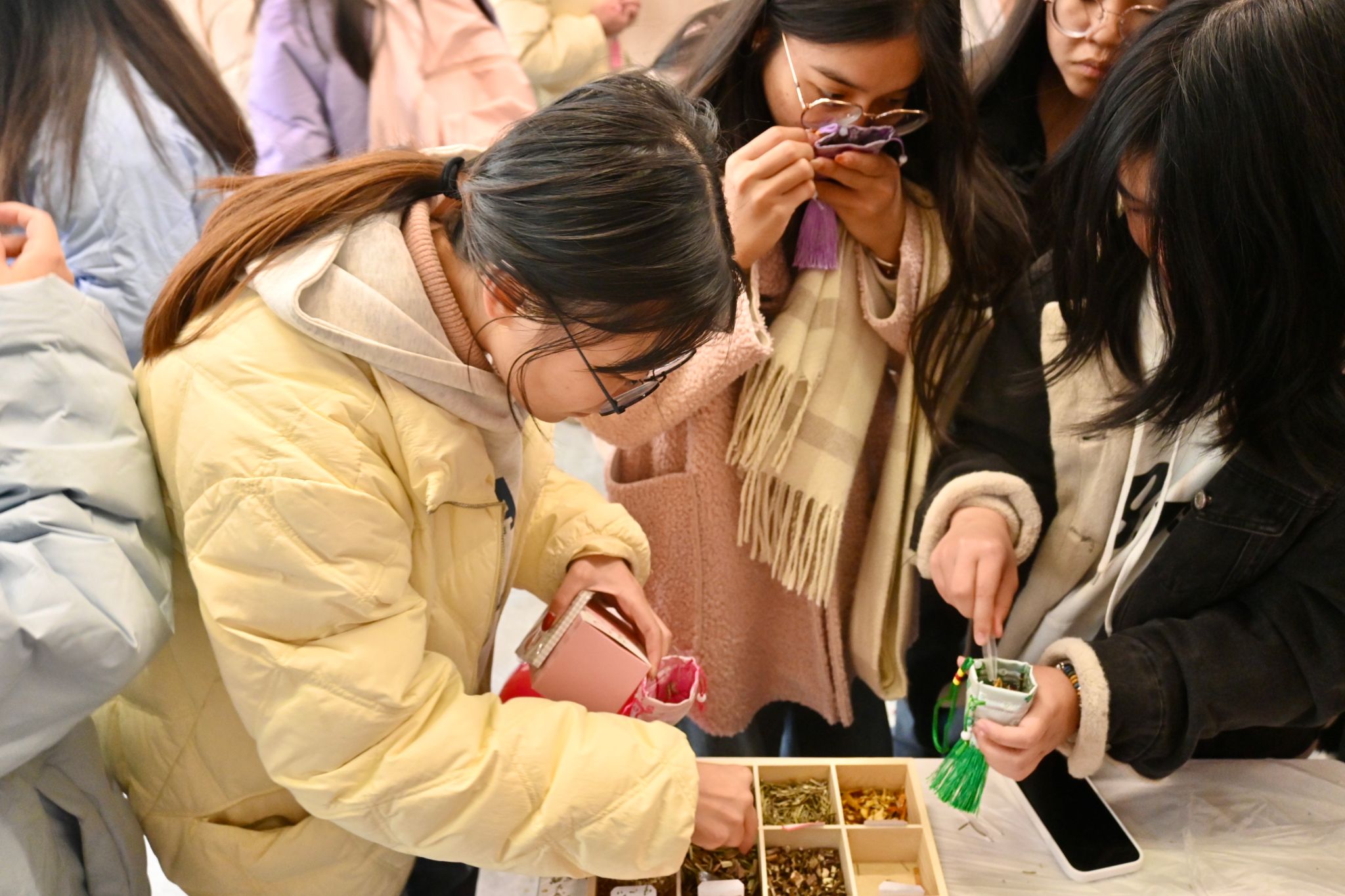 外国语学生社区则组织开展了制作香囊活动,师生们边学习香料的基本知识,边亲手制作具有保健功效的香囊,表达了对新年健康美好的祝福。
