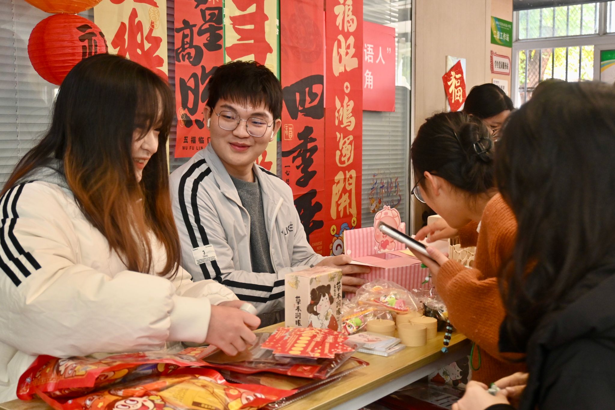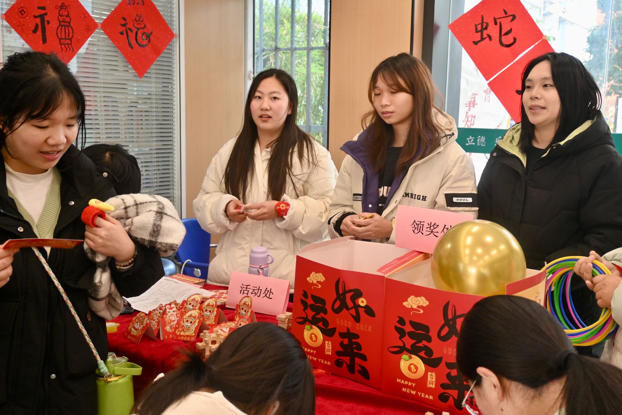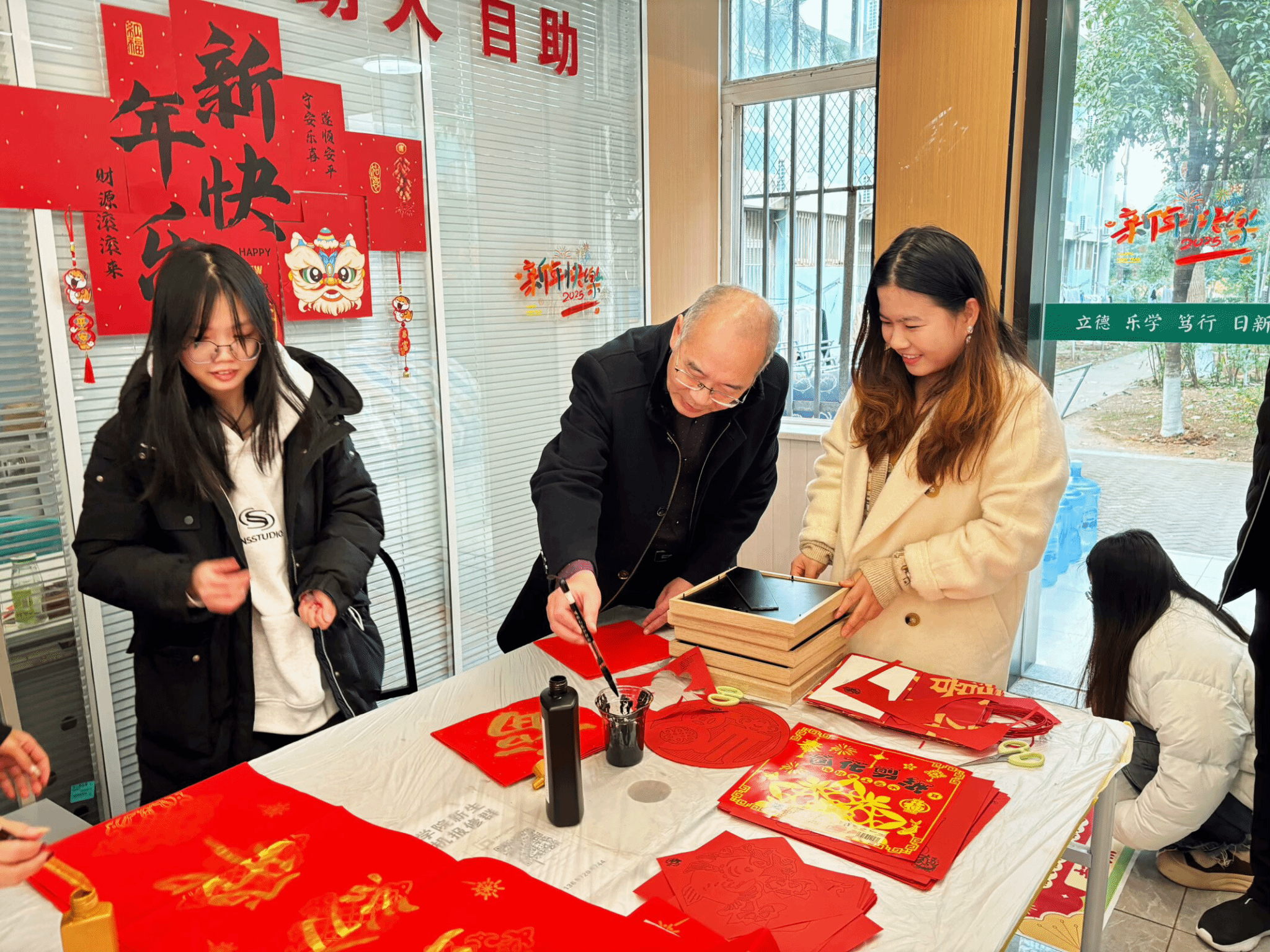 下午1点,在各学院“一站式”学生社区,以“庆元旦·迎新春‘家’年华”为主题的系列活动分别展开。关于中国节日习俗、国风体验、劳动实践、文艺展演、知识竞赛等主题的各种趣味活动纷纷上演,做漆扇、猜灯谜、写贺卡、剪福字……各式活动精彩纷呈,吸引了学生们踊跃参与。校领导们也走进学生中间,询问了解活动的准备和开展情况,与师生们共同许下新年的愿望,感受浓浓的节日氛围。