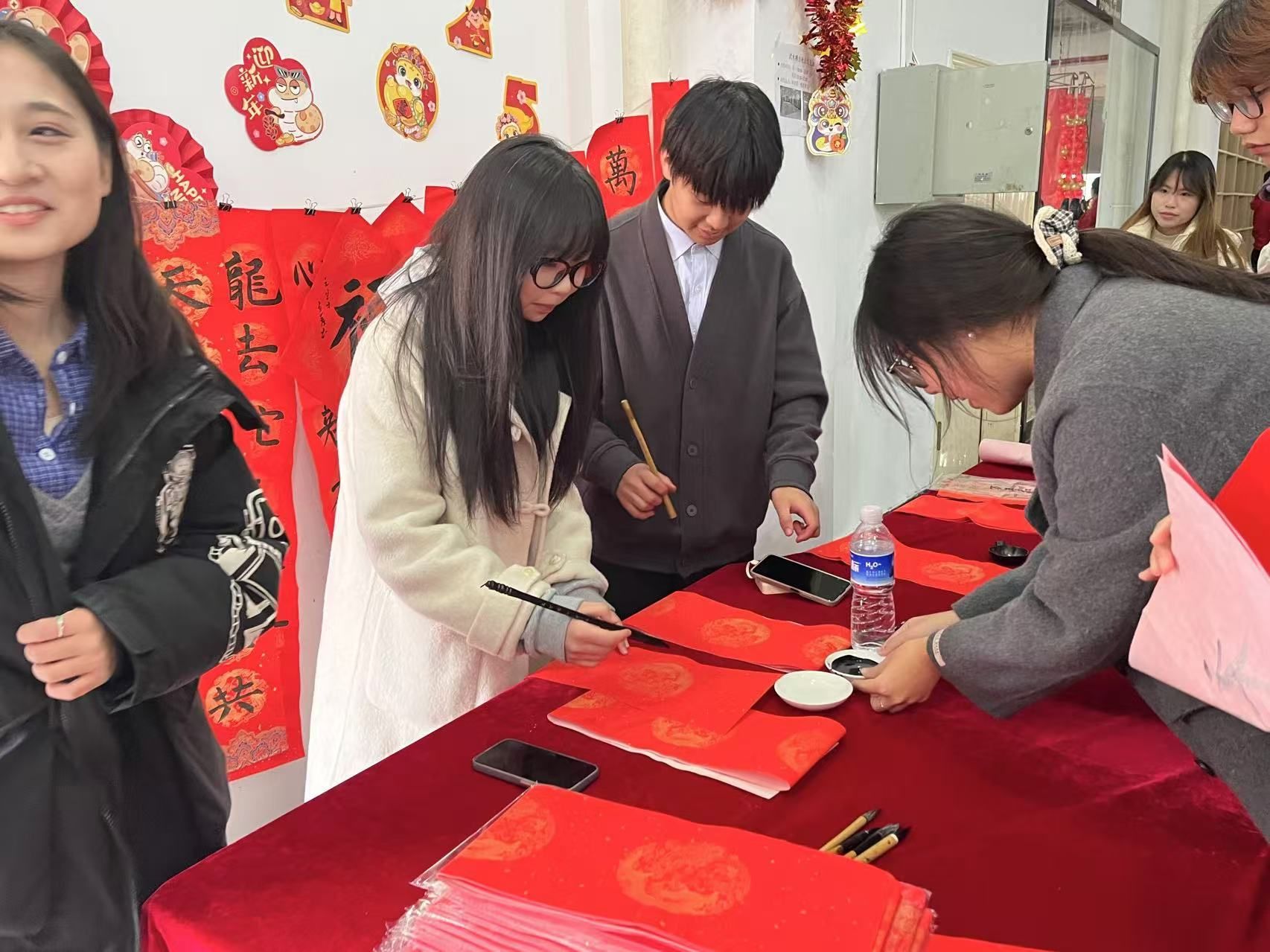 在三楼活动区,各学生组织的活动也吸引了师生们驻足体验。听歌识曲、看图猜物、吹球过河、投壶纳祥……各种趣味游戏让师生们欢声笑语不断。在书法社同学的组织下,校领导与师生们共同挥毫泼墨,一笔一划间,不仅体验了中国传统文化的魅力,也寄托了对新年的美好祝愿。