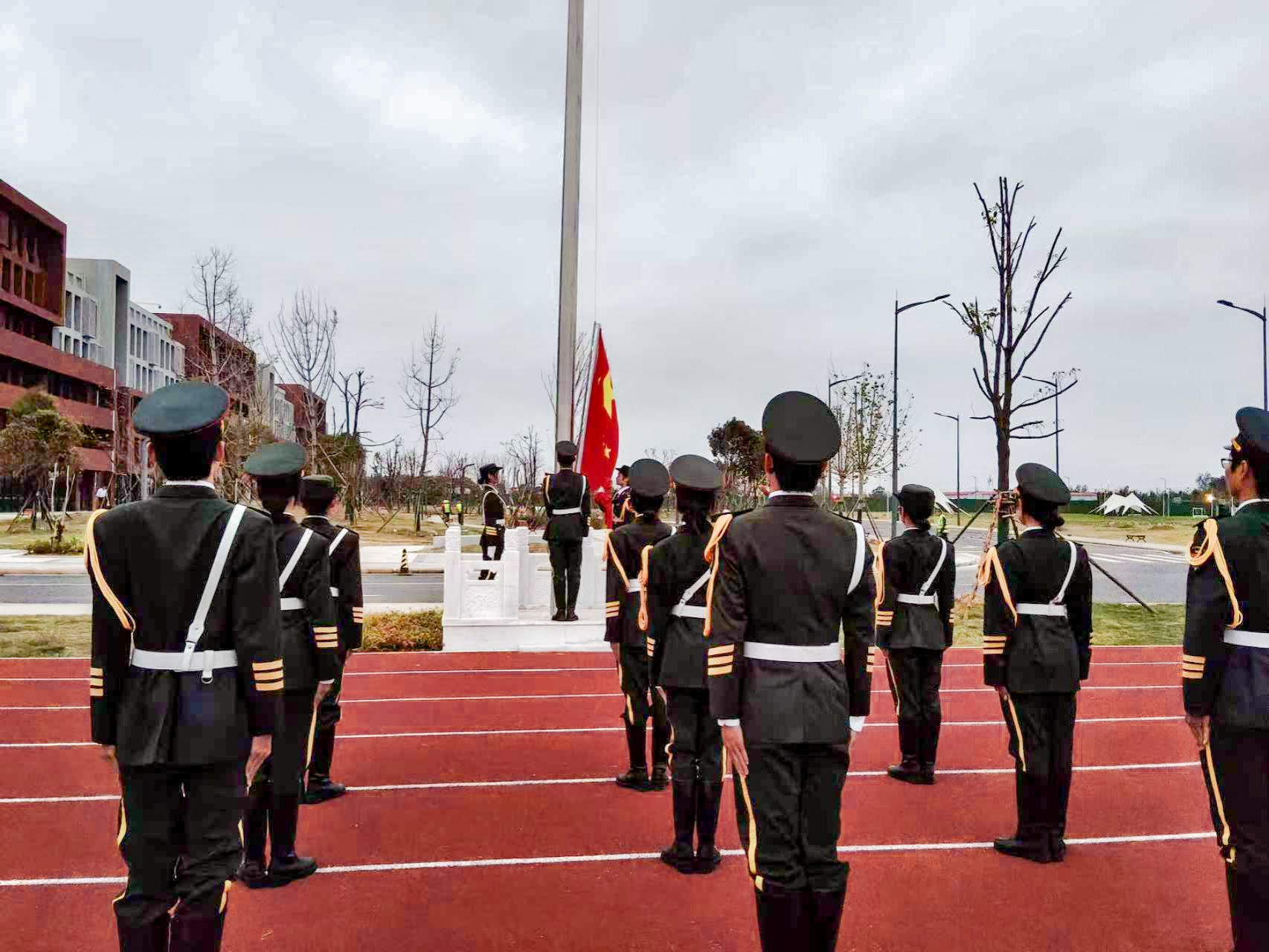 迎着初升的朝阳,升旗仪式正式开始。英姿飒爽的国旗护卫队迈着铿锵有力的步伐,护卫国旗走向升旗台。在全体师生的注视下,五星红旗伴随着雄壮的《义勇军进行曲》冉冉升起,迎风飘扬。现场师生庄严肃立,齐声高唱国歌。