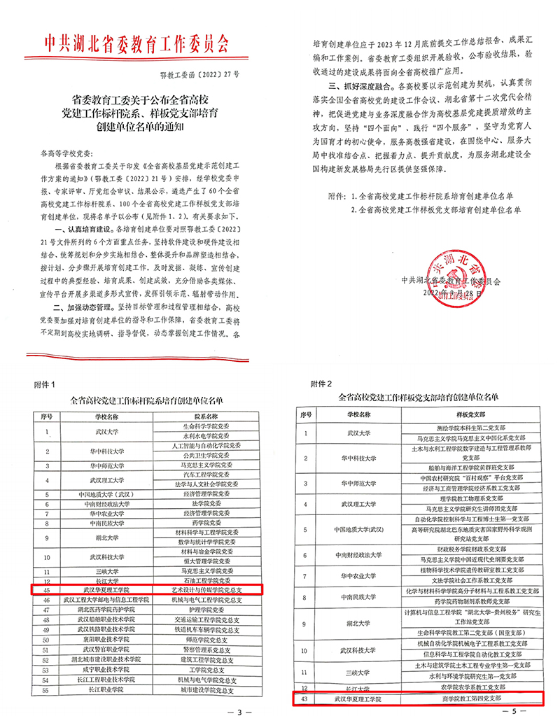 日前,中共湖北省委教育工委公布了全省高校党建工作“标杆院系”“样板支部”培育创建单位名单。beat365艺术设计与传媒学院党总支获批“全省高校党建工作标杆院系”培育创建单位,商学院教工第四党支部获批“全省高校党建工作样板支部”培育创建单位。