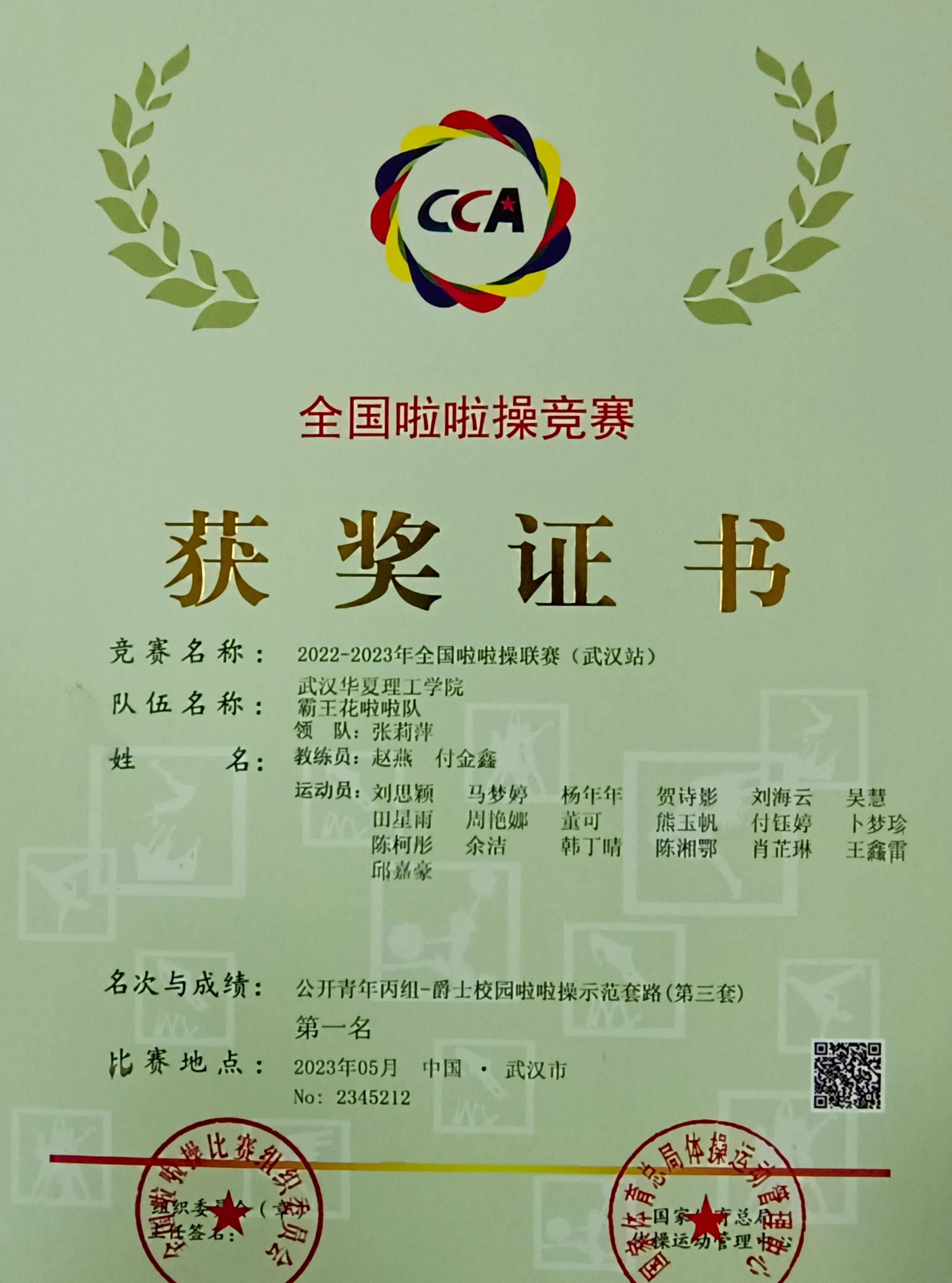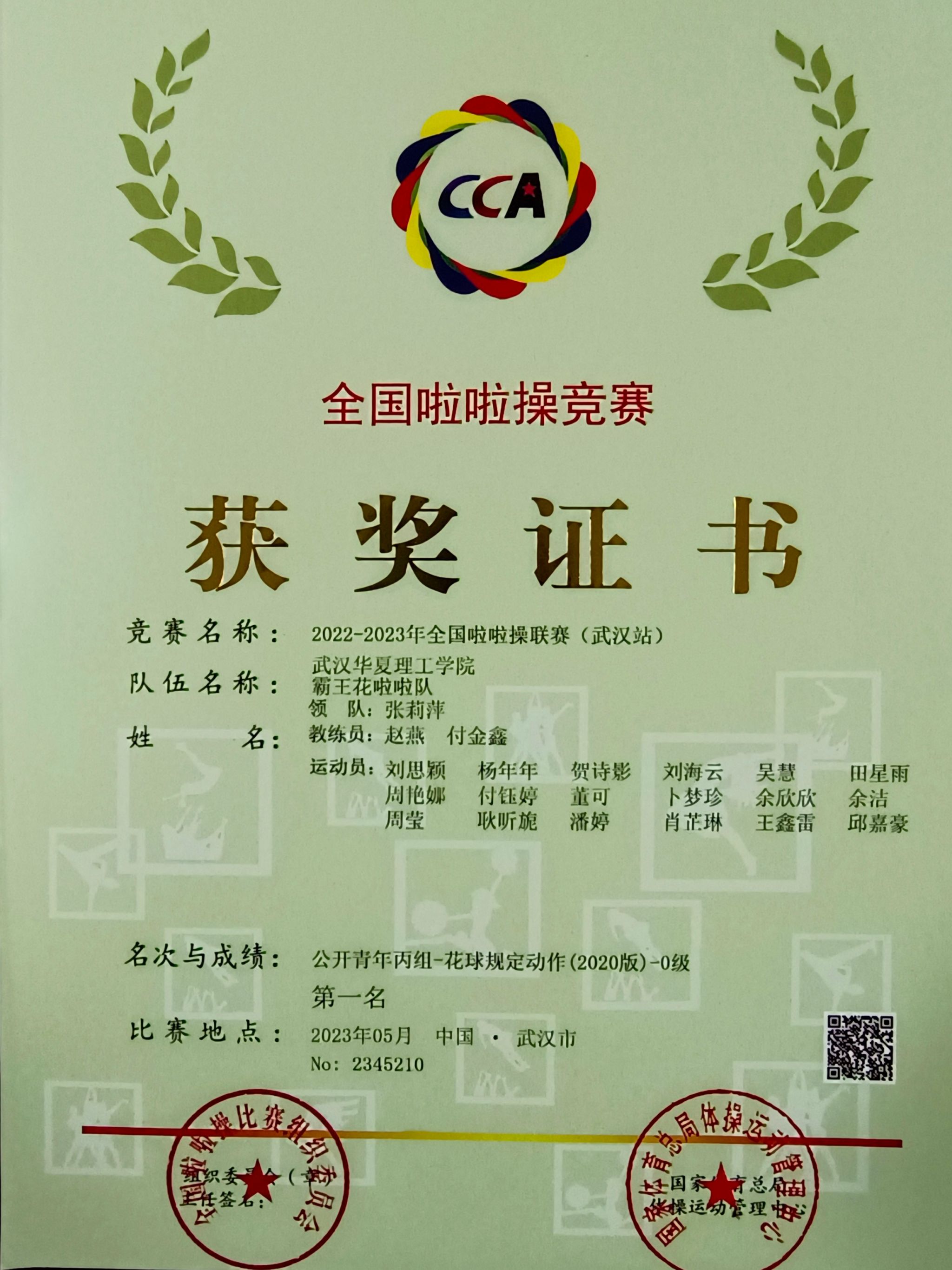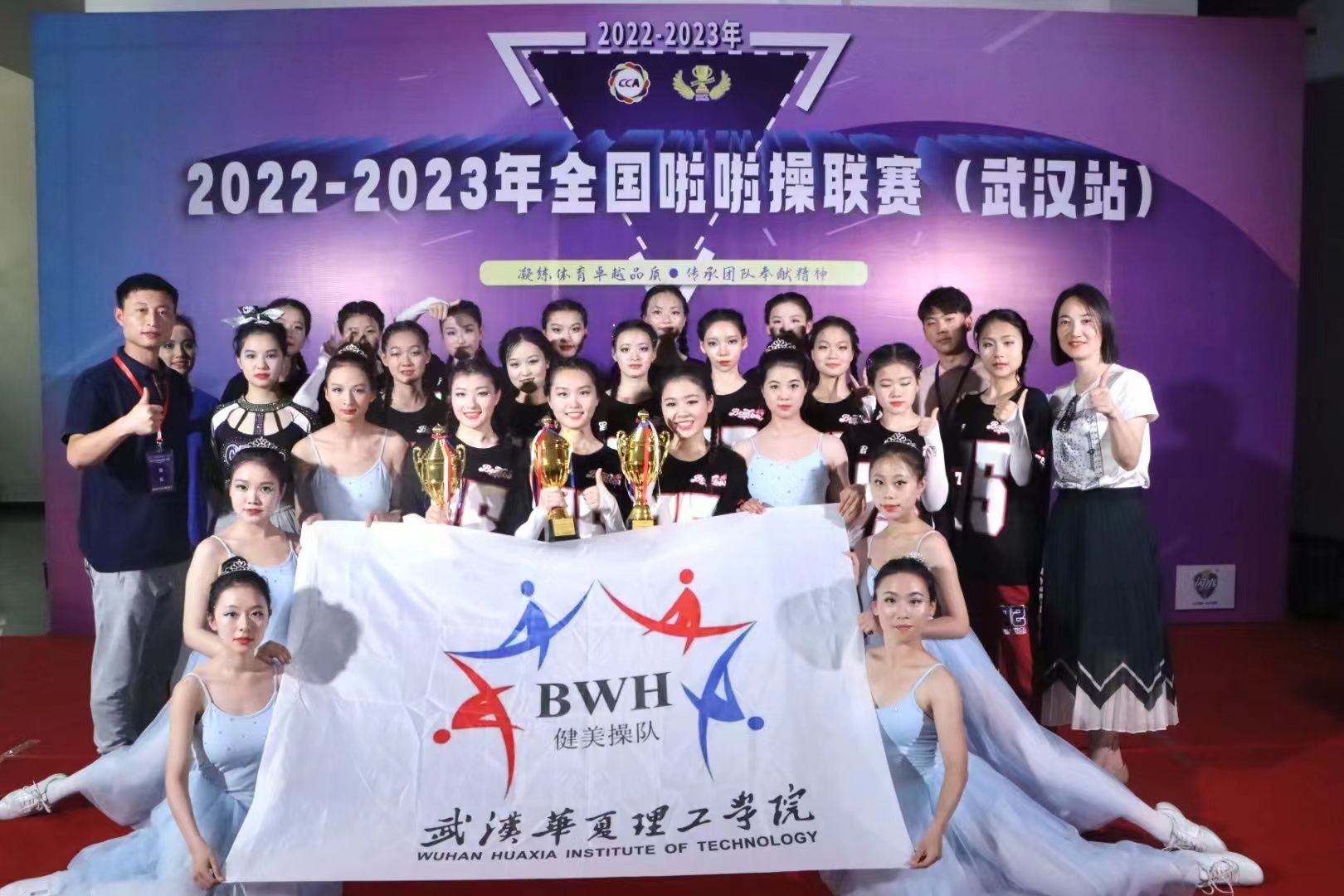 “霸王花”啦啦操队由学校各专业学生共同组成。本次比赛共派出24人,在学校体育学院副院长赵燕、公共体育课部付金鑫老师的带队指导下,队员们通过激烈角逐,斩获2022—2023年全国啦啦操联赛(武汉站)公开青年丙组花球规定动作、街舞规定动作、爵士校园啦啦操示范套路三个项目的冠军。赵燕、付金鑫分别获评优秀教练员、参赛教练员称号。