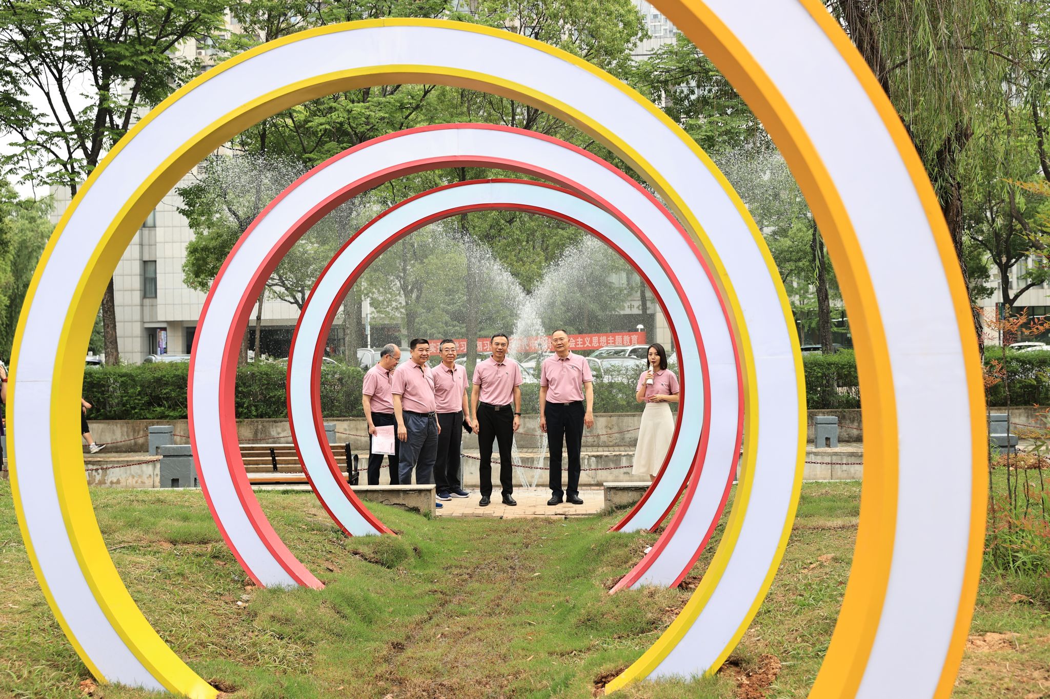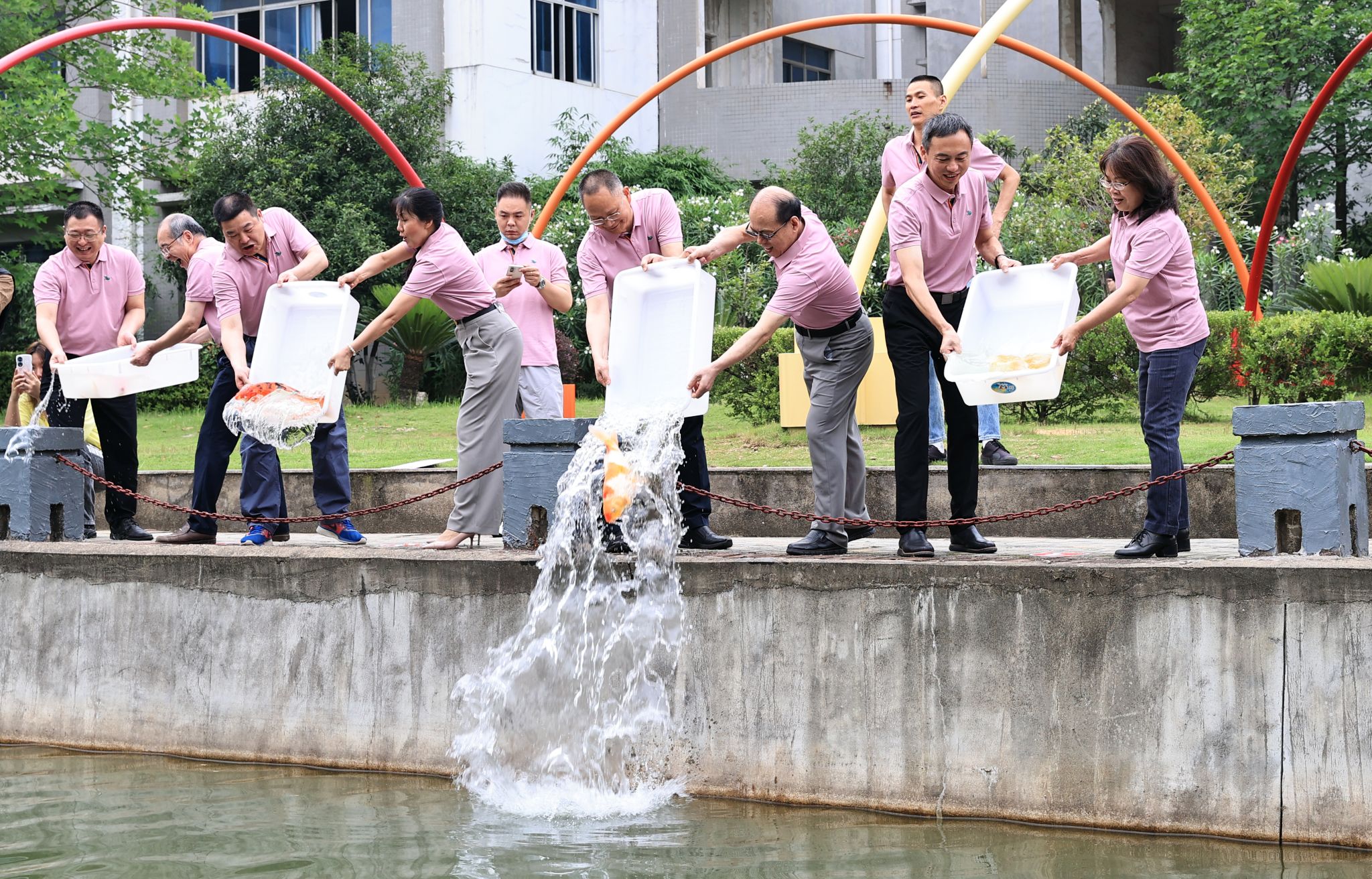 与会人员及师生共同参观“同心华夏”“愉悦华夏”“多彩华夏”校园新景点。一行人穿过玫瑰花廊、同心圆走廊,来到喷泉池边。在“愉悦华夏,锦鲤回归”环节,校领导和各学院院长共同投放锦鲤至涌思泉中,为校园注入新活力。