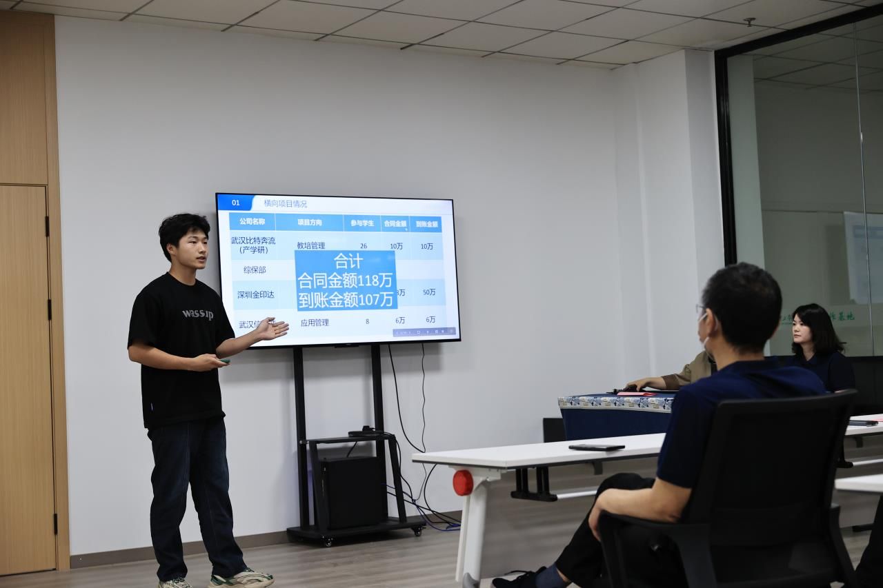 华夏软联工作室成员、计算机1222班胡锐同学从横向项目、反哺教学、学生培养等方面对所在工作室进行简要介绍,对学校给予工作室的大力支持表示感谢。