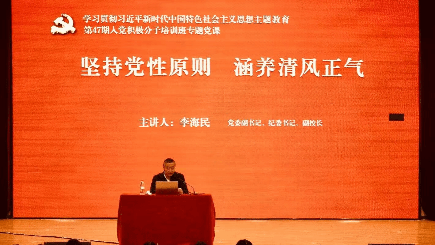 5月23日,校党委副书记、纪委书记、副校长李海民在综合楼学术报告厅讲授《坚持党性原则,涵养清风正气》主题党课,第47期入党积极分子培训班以及2023年第2批党员发展对象培训班全体学员聆听授课。