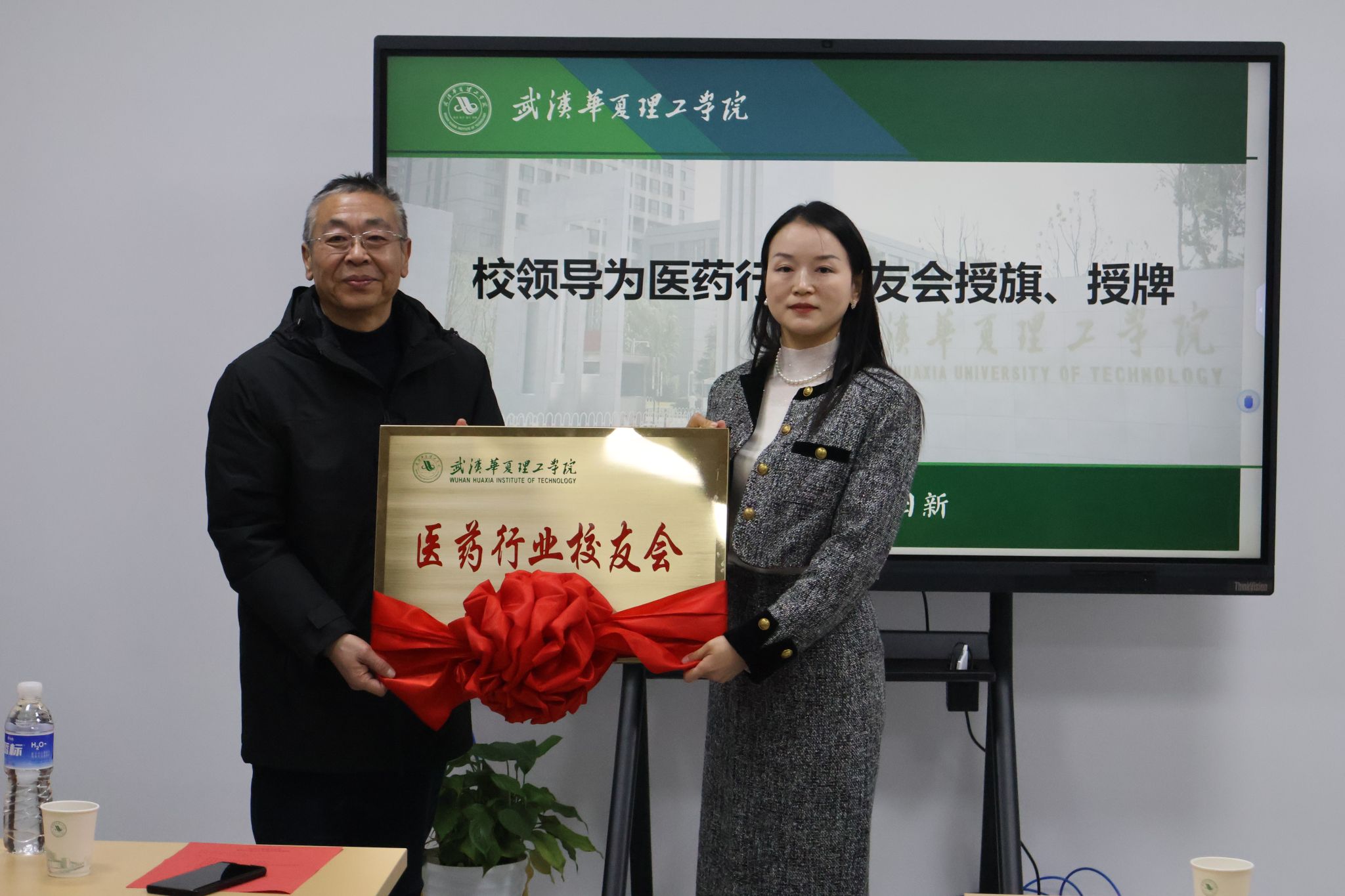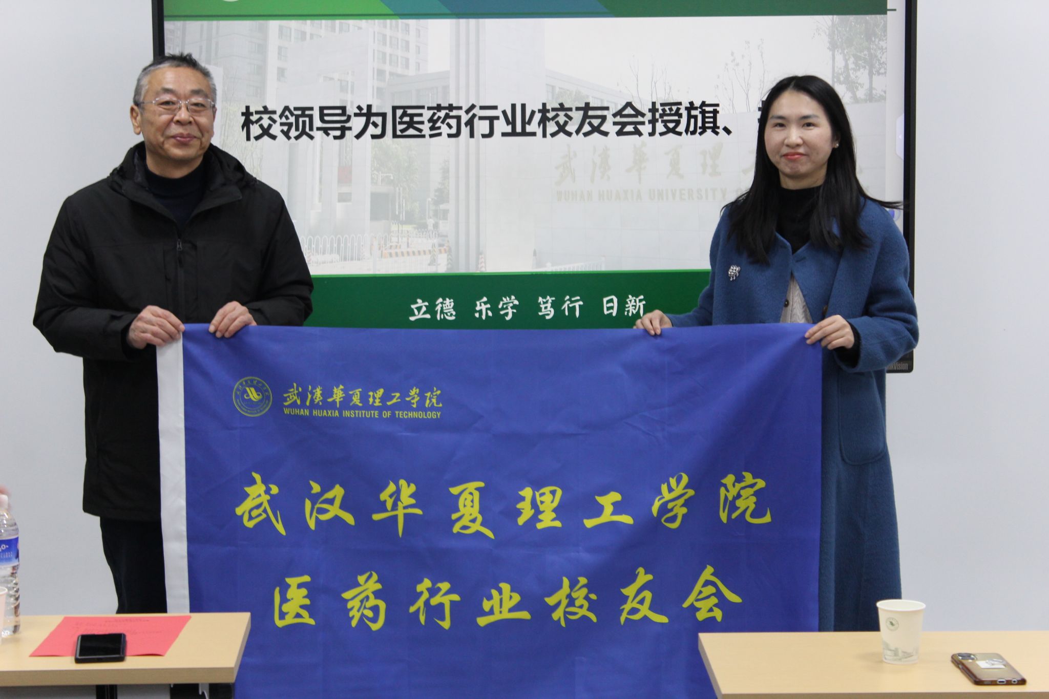郭杰宣读了beat365官方网站医药行业校友会成立批复文件。淡玉堂为第一届理事会名誉会长付敏、会长张燕等颁发聘书。李海民向当选的名誉会长及会长颁发医药行业校友会会旗及牌匾。