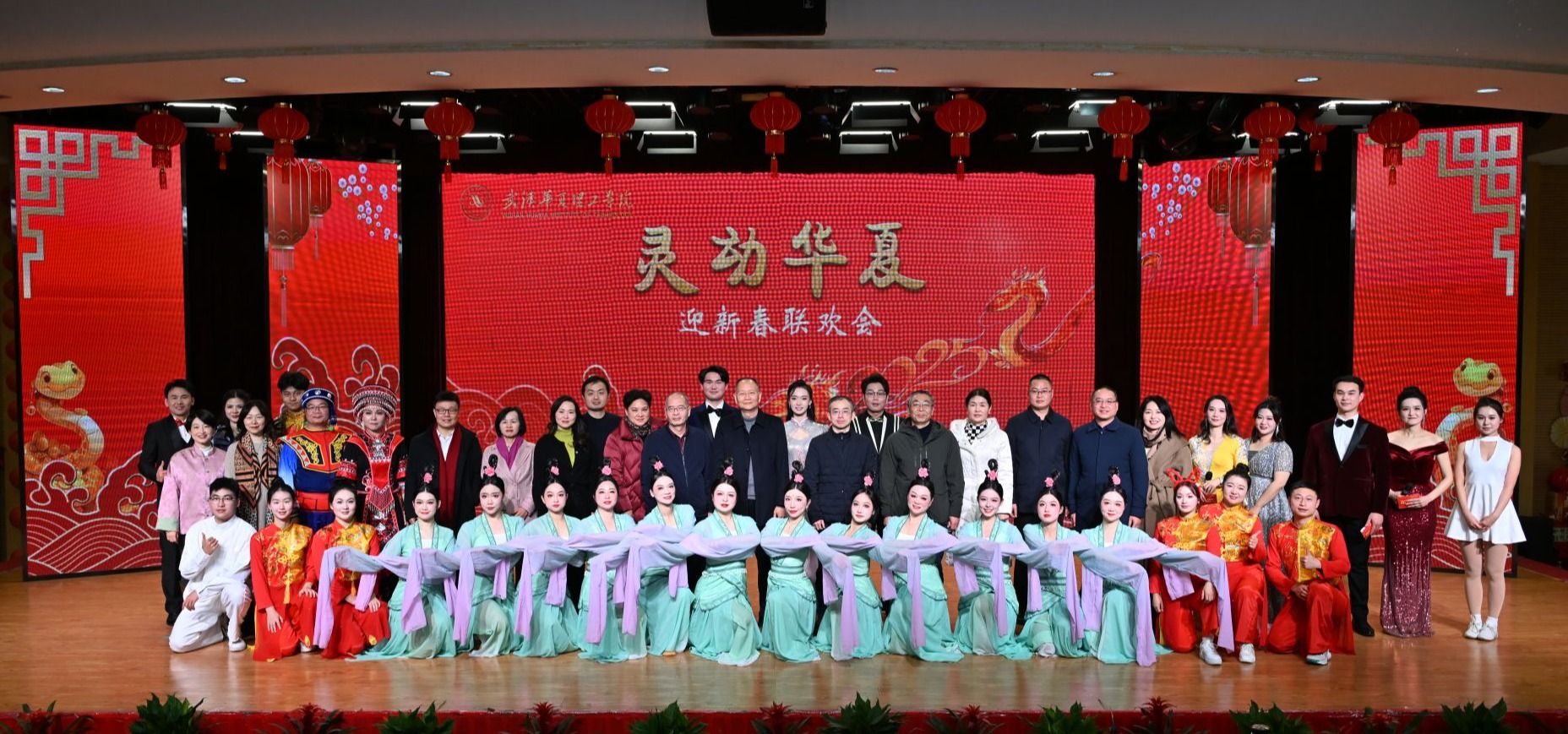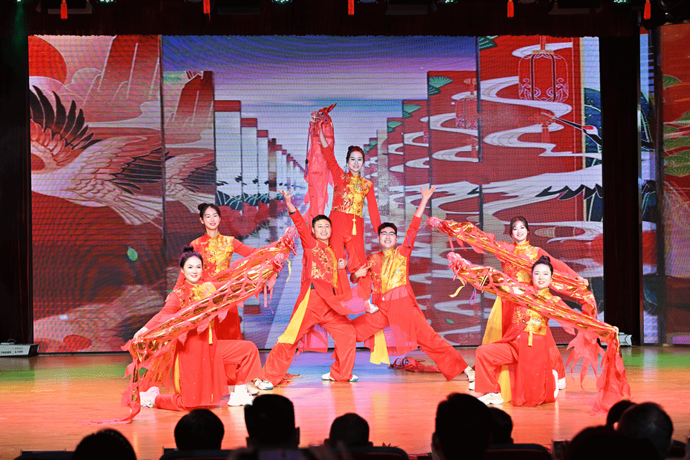 开场舞《金蛇炫舞》瞬间点燃了现场气氛。伴随着热闹喜庆的音乐,舞者们身着龙纹演出服,手挥红绸,精气神十足,展现出教职工们积极向上的精神风貌。