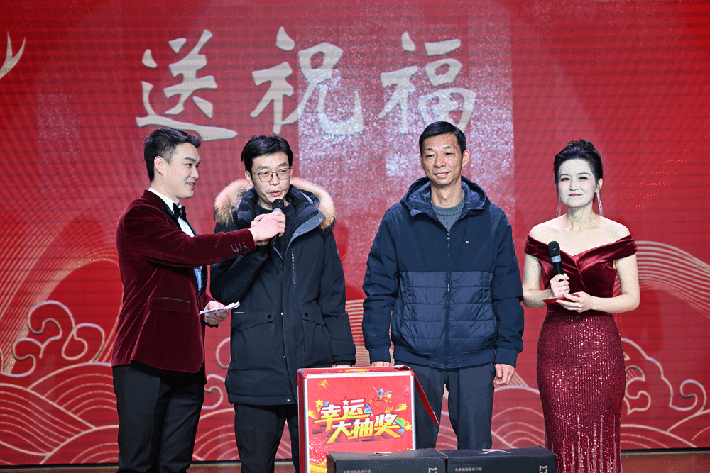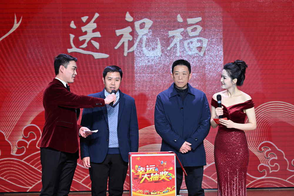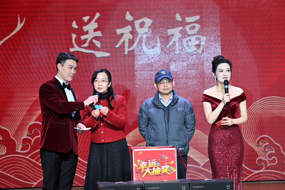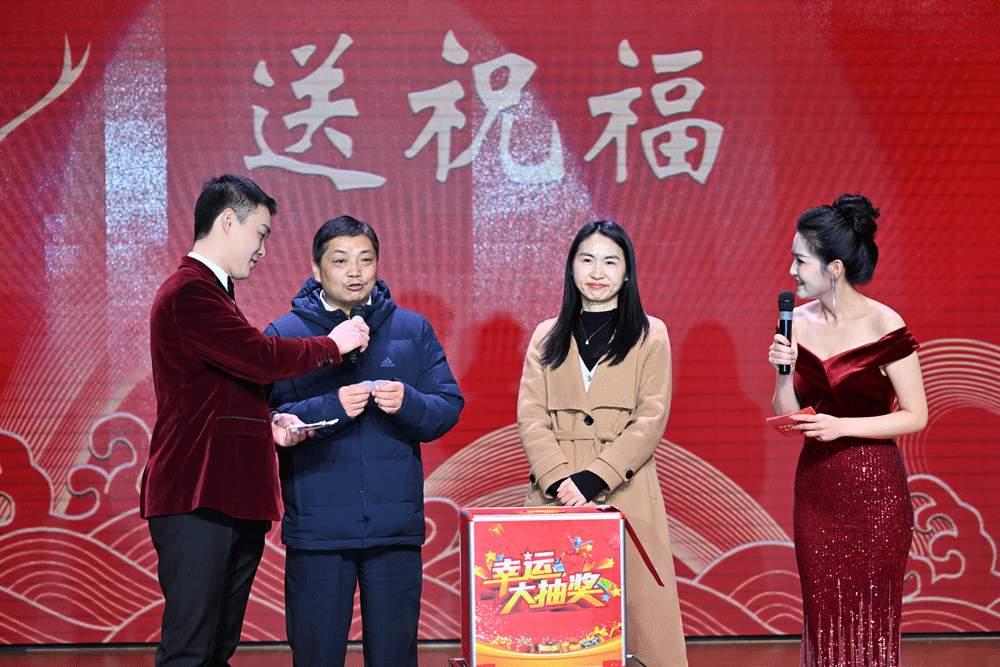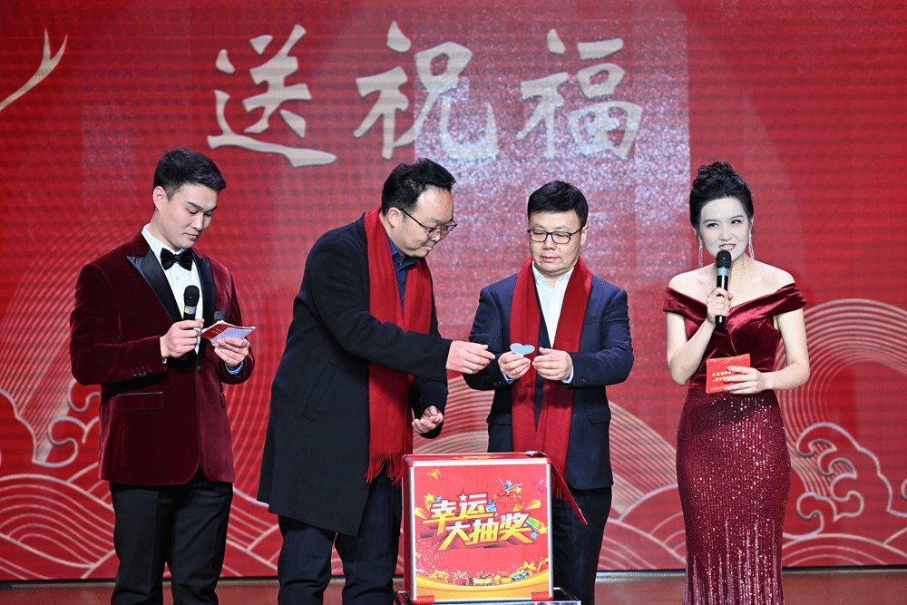 《九龙送祝福》抽奖环节压轴出场。各学院院长和院党总支副书记依次登台,为观众精心送上“平安”“欢乐”“喜庆”“发财”等主题的祝福,并现场随机抽取幸运儿,为他们送上空气炸锅、行李箱、料理机等丰富实用的奖品,教职工们在欢声笑语中收获满满的惊喜和幸福。