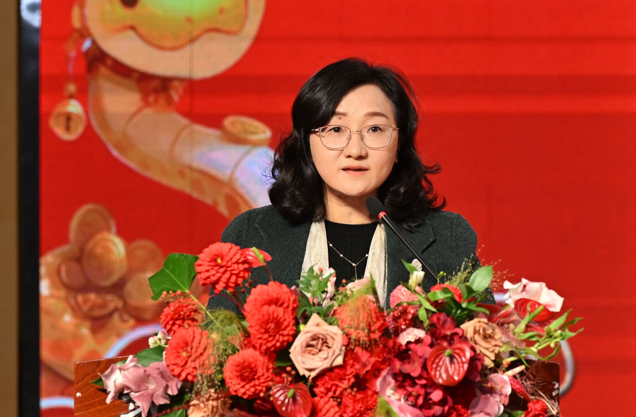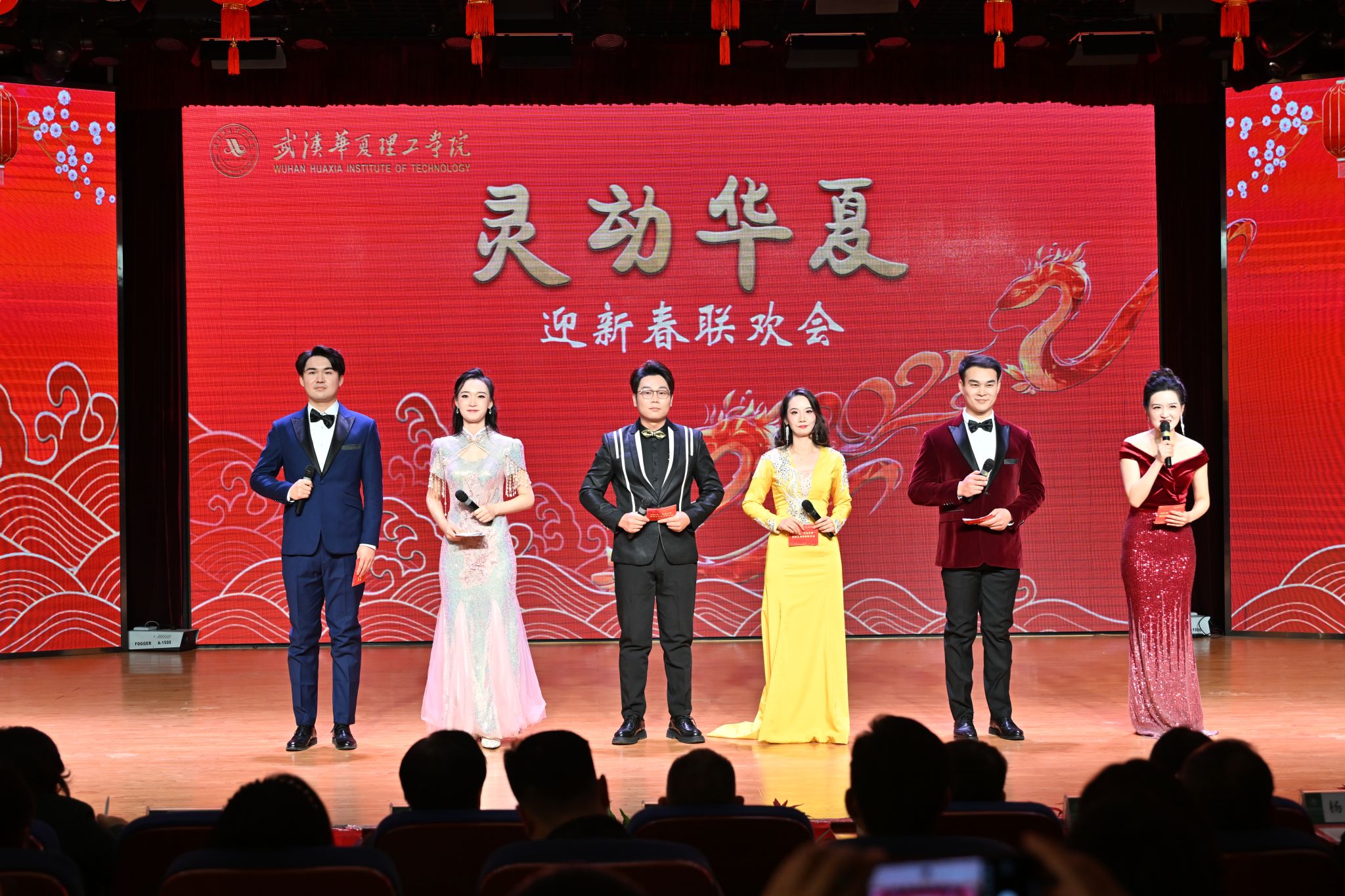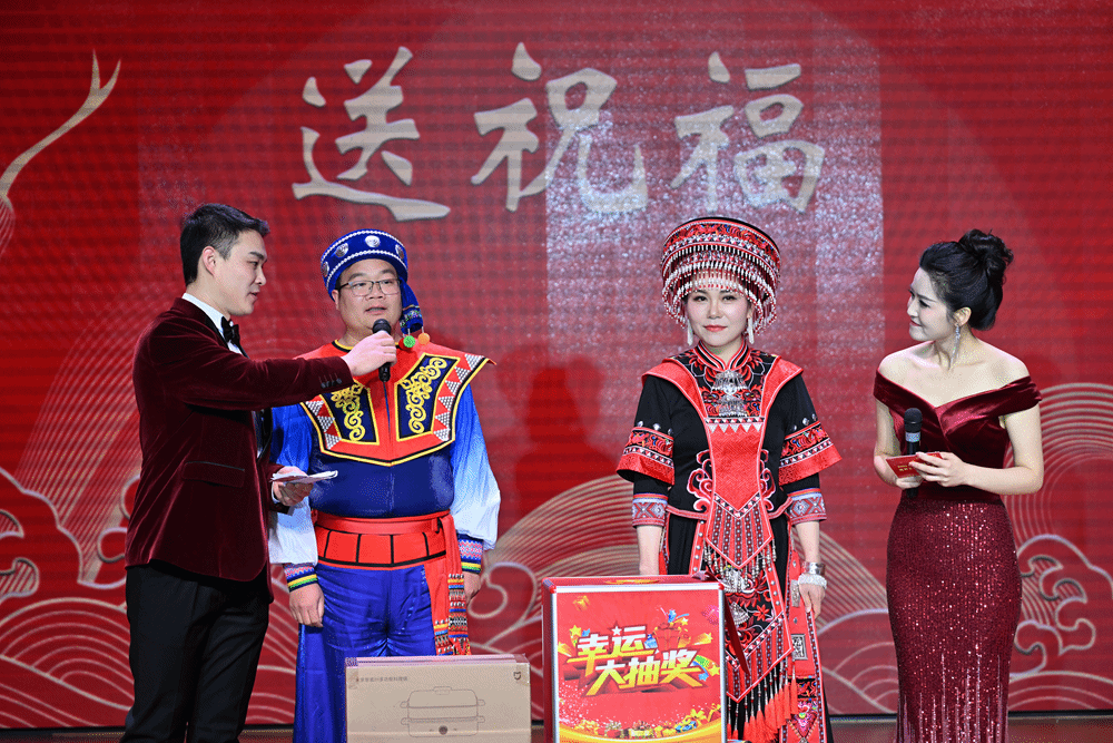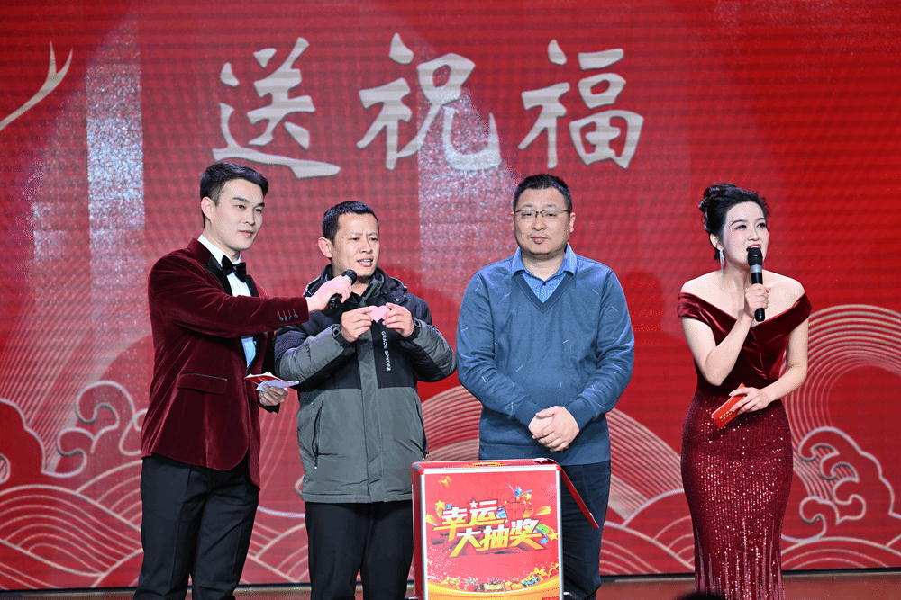 《九龙送祝福》抽奖环节压轴出场。各学院院长和院党总支副书记依次登台,为观众精心送上“平安”“欢乐”“喜庆”“发财”等主题的祝福,并现场随机抽取幸运儿,为他们送上空气炸锅、行李箱、料理机等丰富实用的奖品,教职工们在欢声笑语中收获满满的惊喜和幸福。