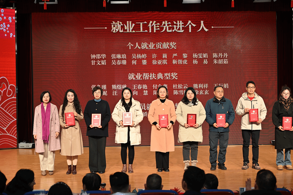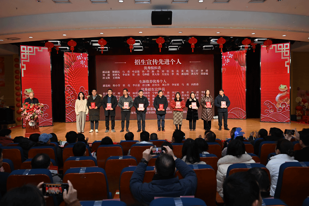 副校长李猜宣读表彰决定。与会领导依次为获奖集体和个人颁发就业工作奖项、工会工作奖项、招生宣传奖项和2024年度考核奖项。