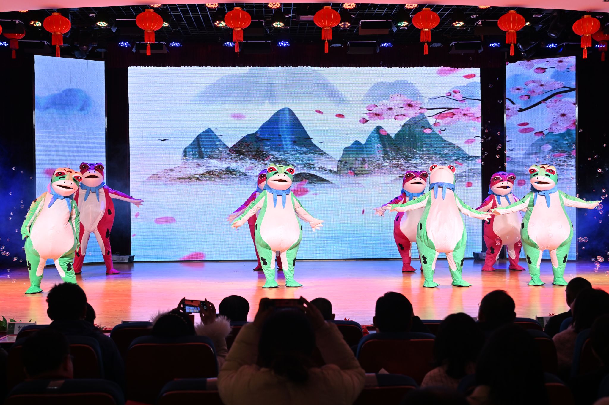 “我在这儿等着你回来,等着你回来,看那桃花开……”头戴青蛙头套的“华夏先生们”一出场就吸引了观众眼球。俏皮的音乐,憨态可掬的形象,搭配轻盈且富有节奏感的舞姿,引得现场笑声连连。