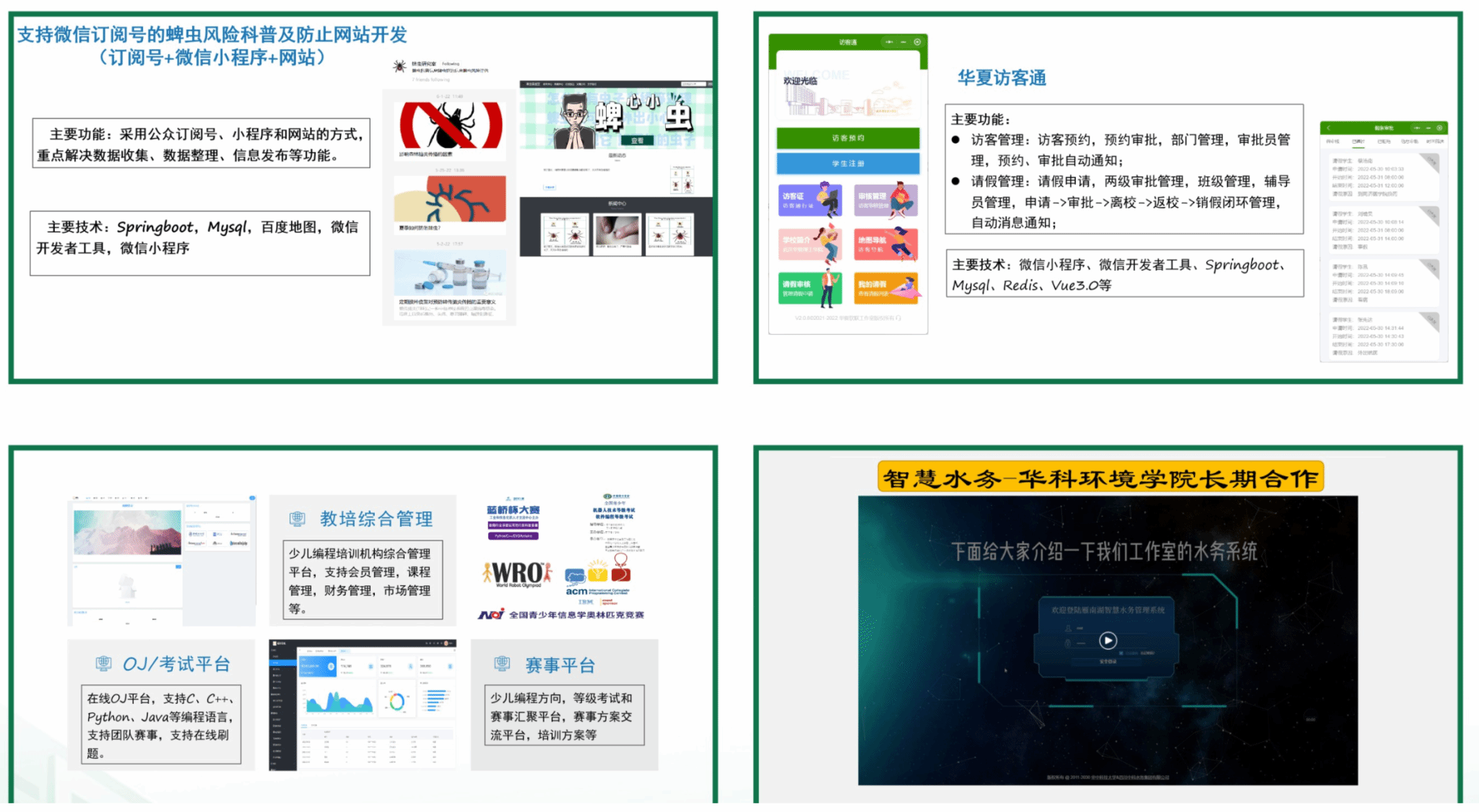 近年来,工作室积极服务湖北省中小企业,成功实施了OA管理平台开发、机器人编程赛事综合服务平台构建、微信订阅号支持的蜱虫风险科普与防治网站开发、基于微服务架构的FTTX设备管理系统研发、打印机芯片自适应控制管理系统设计,以及呼叫中心系统数据库应用服务器管理等多项科技创新项目,累计研究经费达120万余元。
