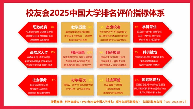 校友会中国大学排名首发于2003年,至今已有23年的历史,已成为具有广泛社会影响力、公信力、参考价值与创新力的中国大学排名领先品牌,评价高校涵盖了中国海峡两岸暨香港澳门地区的2000多所本科院校和高职(专科)院校。校友会2025中国大学排名评价指标体系由办学层次、思政教育、教学质量、杰出校友、高层次人才、学科专业、科研项目、科研基地、科研成果、社会服务、社会声誉和国际影响力等12个一级指标组成,基于“大平台、大团队、大项目、大成果、大校友”体系框架展开系统评价,覆盖的评估指标高达900多项。