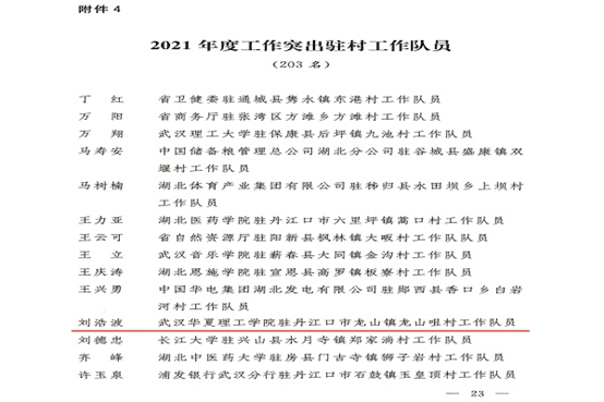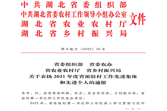 近日,中共湖北省委组织部、中共湖北省委农村工作领导小组办公室、湖北省农业农村厅、湖北省乡村振兴局联合发文,对2021年度工作实绩突出的派出单位、驻村工作队、驻村第一书记(工作队长)和驻村工作队员予以通报表扬,beat365驻丹江口市龙山镇龙山咀村工作队队员刘浩波同志获得“2021年度工作突出驻村工作队队员”荣誉称号。