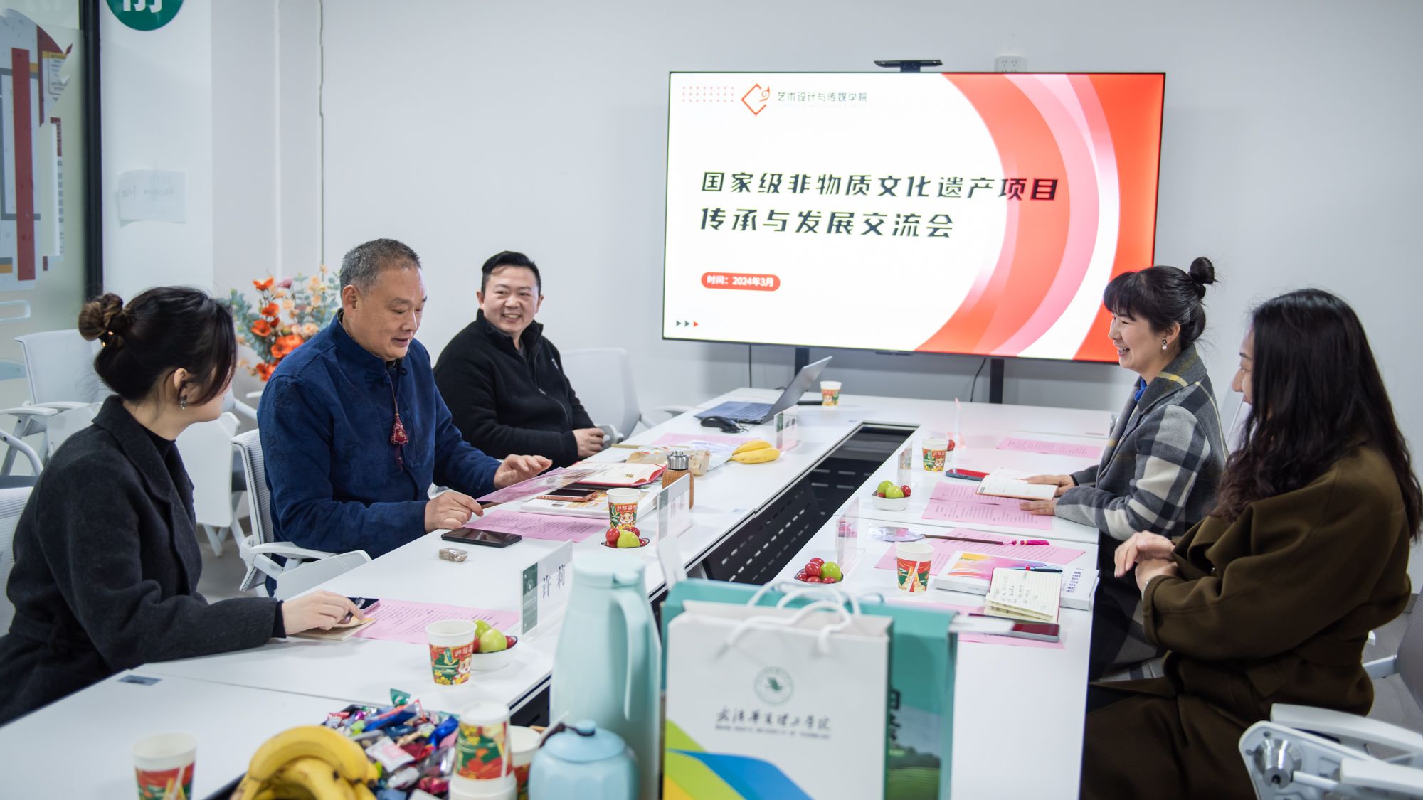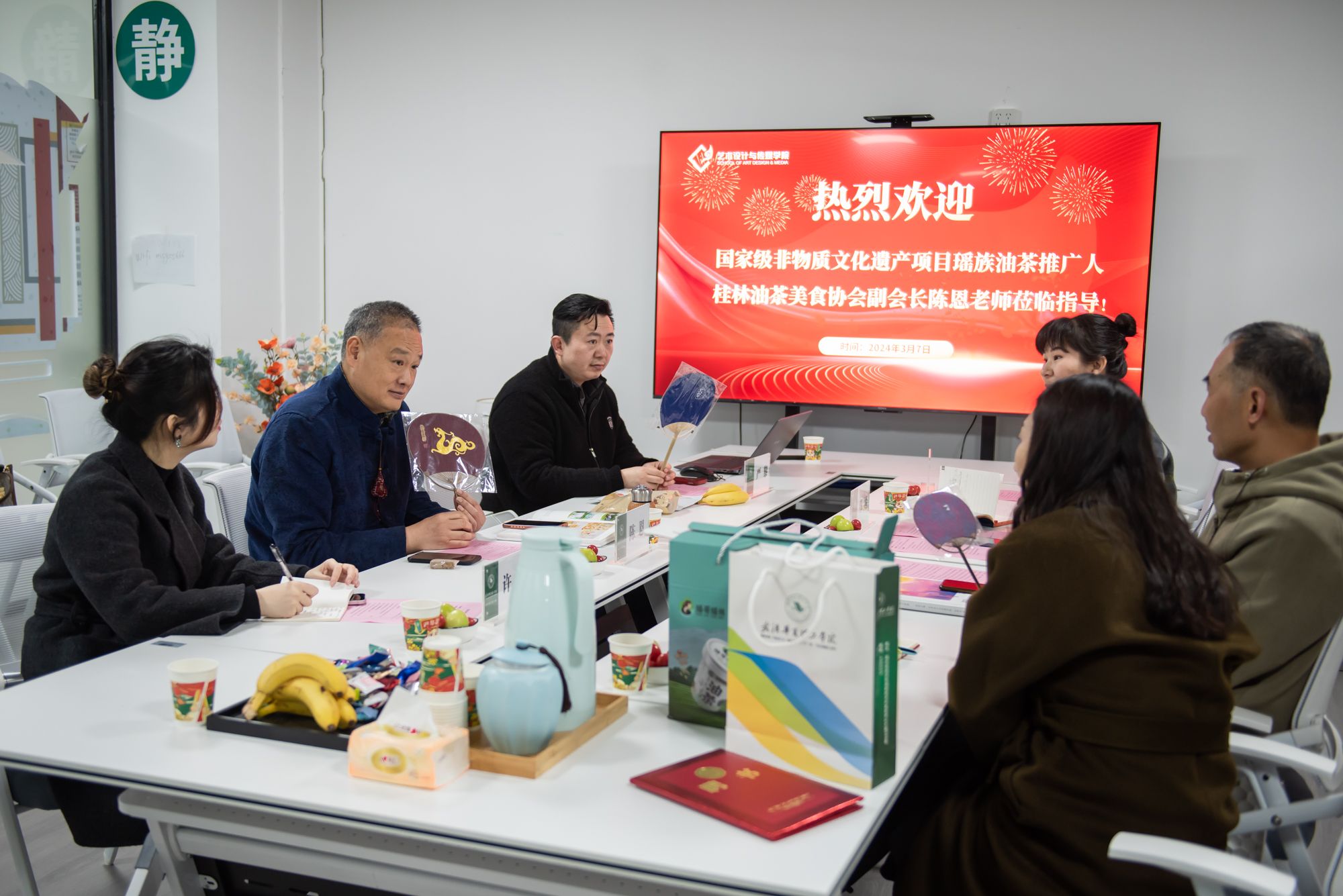 2024年3月7日,我院在综合楼湖北名师工作室举办了“国家级非物质文化遗产项目交流会”。本次交流会邀请到国家级非物质文化遗产项目瑶族油茶推广人、桂林油茶美食协会副会长陈恩老师参加。艺术设计与传媒学院名誉院长路由、副院长张天洁、副院长邓婧、公共艺术课部主任许莉、实验中心主任严虎和1957设计中心主任严黎参会。