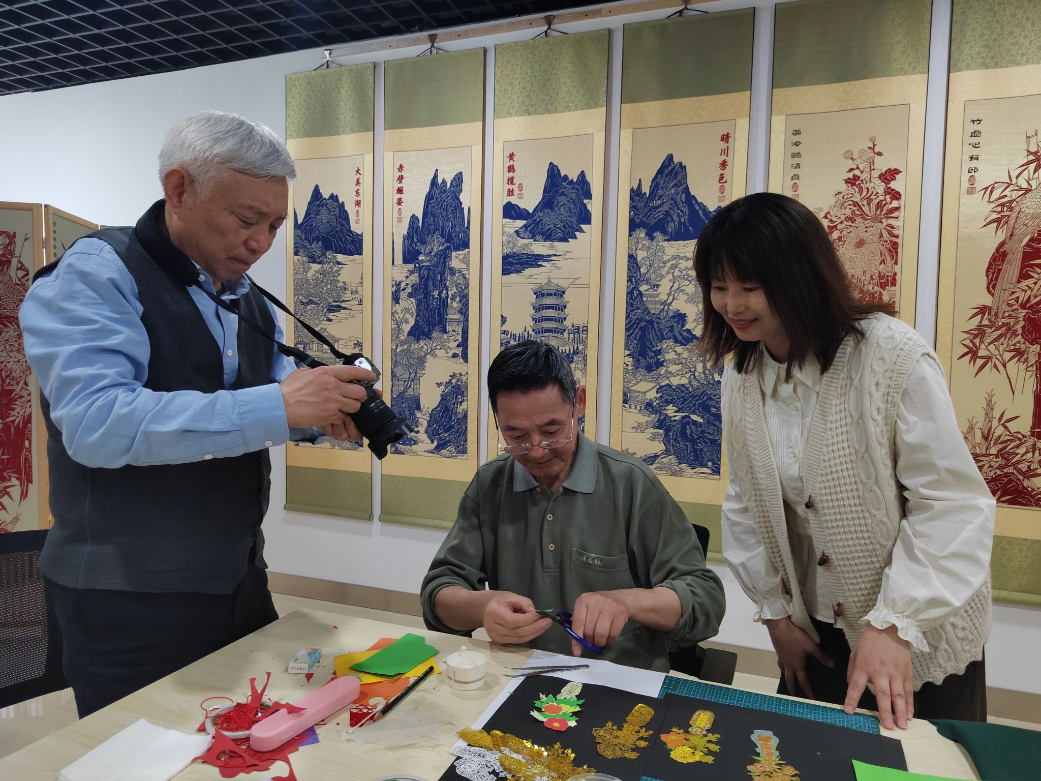 4月28日上午10点国家级非遗传承人、中华文化促进会常务副会长杨兆群老师、林争老师,以及鄂州雕花剪纸项目省级传承人曹小琴老师一行人抵达沈老师的剪纸工作室进行专访。走进沈老师工作室就会置身于剪纸的世界,墙壁两边依次挂着不同主题的剪纸作品,在精细的装裱工艺下显得格外精美。沈老师为来访的老师们介绍了每幅作品表达的内容和含义,杨婷婷老师则做好拍摄记录、录音等工作。其中沈老师为大家展示的长达12米的长卷《劳动者之歌》剪纸作品将武汉电力工作者兢兢业业的精神展现得淋漓尽致。当天杨老师作为沈松柏老师的徒弟,也为前辈们展示了武汉剪纸的方法——先用金色的特殊纸张把基础图案雕刻出来,再衬以各种颜色的彩色纸张,每一步工作都需要集中精力用心完成。各位前辈一起交流探讨着剪纸风格的形成和未来发展。杨兆群老师在观摩到沈老师用金色纸张雕刻的《百鸟朝凤》时,激动得表示:“像这些精品可以尝试用金箔来完成,这样色彩更容易保持。”而在欣赏到沈老师创作的具有武汉剪纸风格的《武汉风光》、《龙凤呈祥》还有《门神》时,杨兆群老师一行人更是赞不绝口,表示沈老师所创作的武汉剪纸这种风格非常独特,金色和彩色搭配在一起形成了独有的武汉风格。