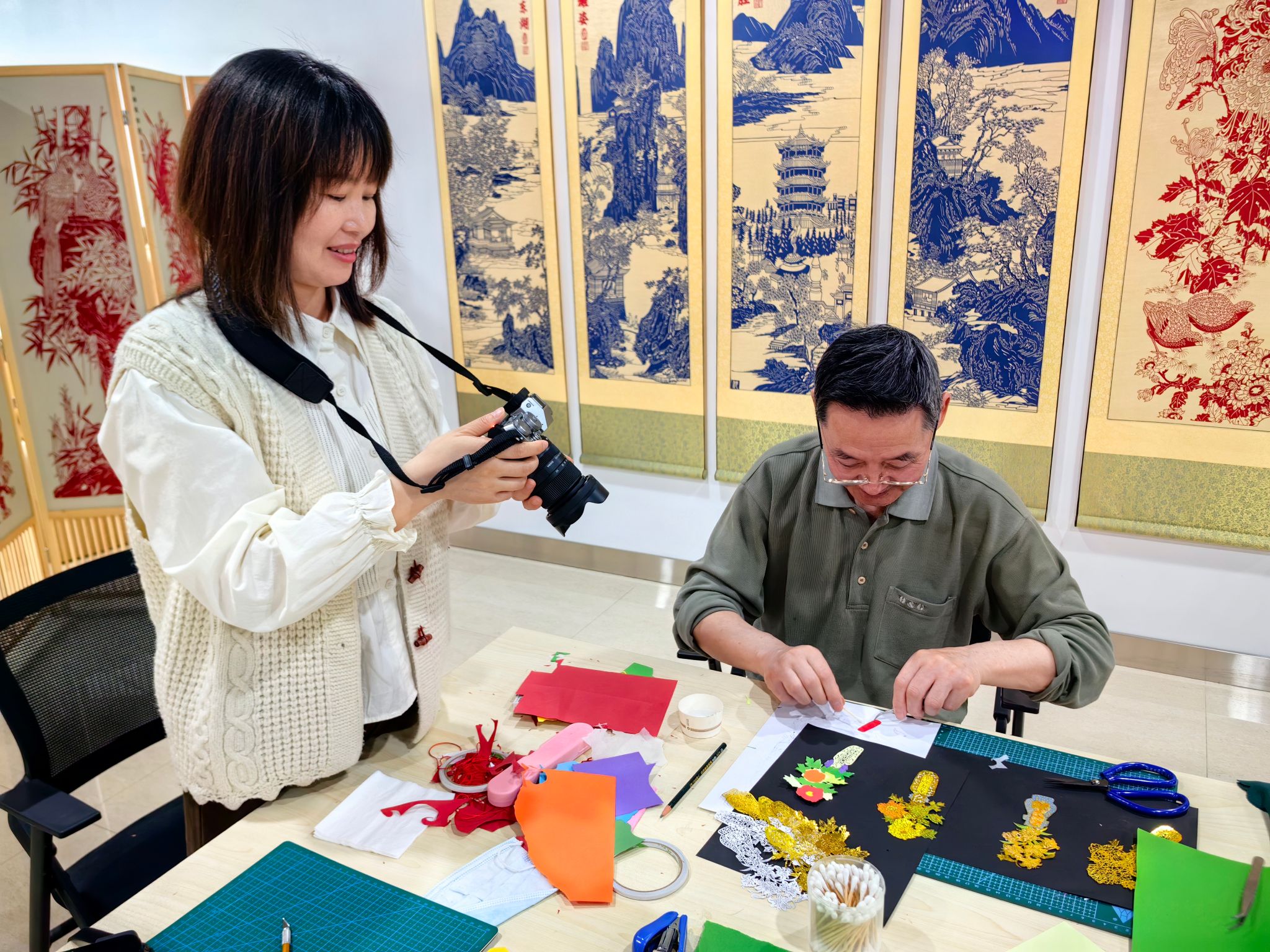 为了加强教师校外交流学习能够提升教师专业能力,开拓视野,提升教学水平。近日,艺术设计与传媒学院视觉传达设计系“焕然”品牌实验室教师杨婷婷受湖北省非遗传承人沈松柏老师邀请到剪纸工作室辅助接待工作。