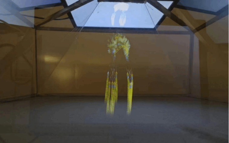 “太极生两仪”,数字媒体艺术系1211班张嘉豪、王玮峰、尹旭祥、吕晨瑞、李睿通过Kinect进行人物形态捕捉数据实时映射并生成粒子太极。整体的表现方式是以粒子的形态进行展示,通过动态的粒子形态进行互动,使人们体验到太极文化中的动静结合、柔与刚并存的特点,通过粒子的运动和变化展现太极文化的动态和无限可能,通过观察与太极文化进行互动,让人们可以更好的理解太极文化中的自然和谐共处之道。