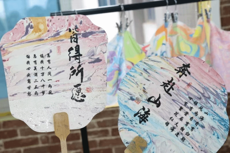 活动尾声,教师们纷纷展示自己的作品。水拓丝巾色彩斑斓、图案独特;漆扇则工艺精湛、韵味十足。这些作品不仅展示了教师们的创意与才华,更是流动艺术与传统文化完美结合的生动体现。